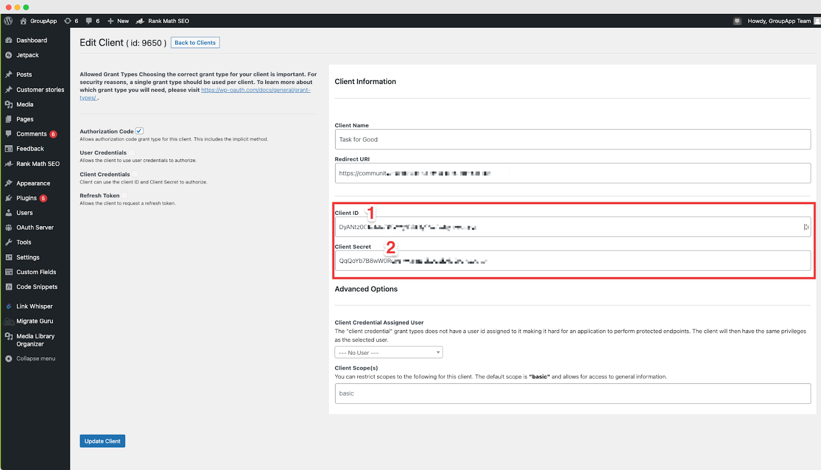 Once you click the "Create Client" button, the page will refresh and you will see the client ID and Client secret auto-populated.