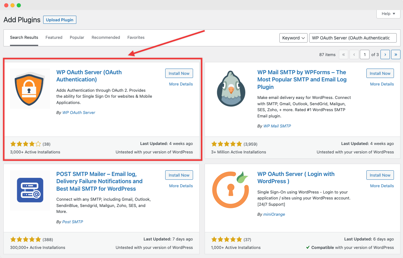 Step 4: On the add plugins page, search for the plugin "WP OAuth Server (OAuth Authentication)" and install the WP OAuth Server (OAuth Authentication) plugin.