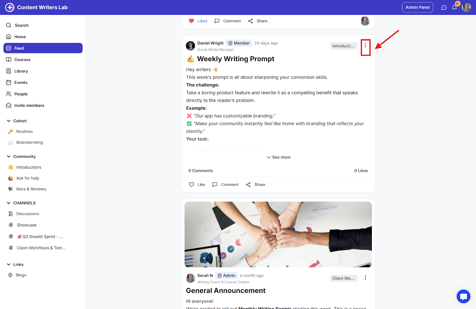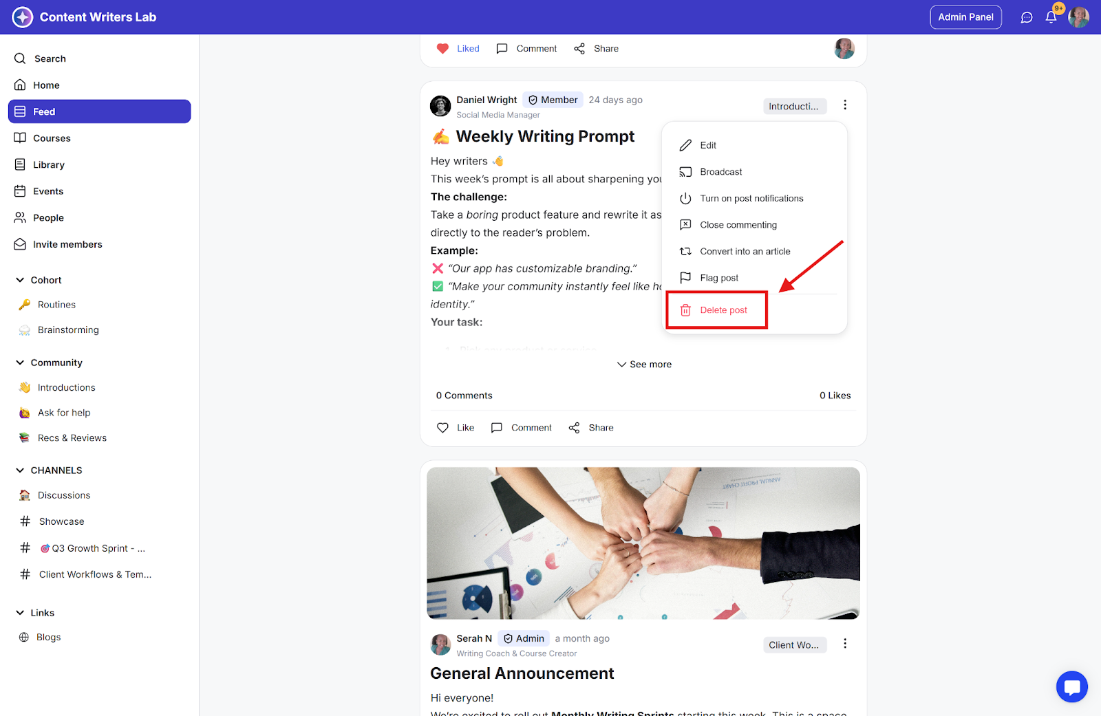 As an admin, you can delete both your own posts and posts created by community members that you consider inappropriate or unnecessary.