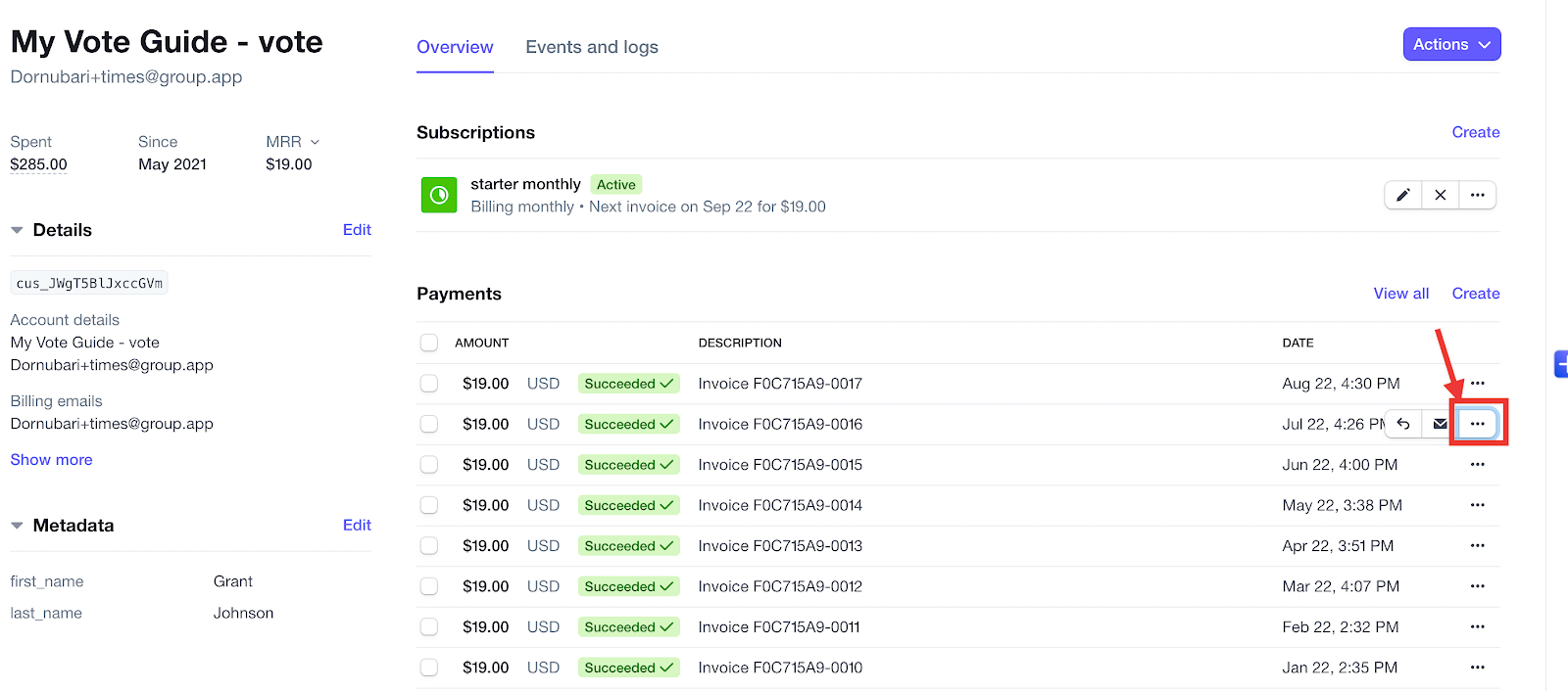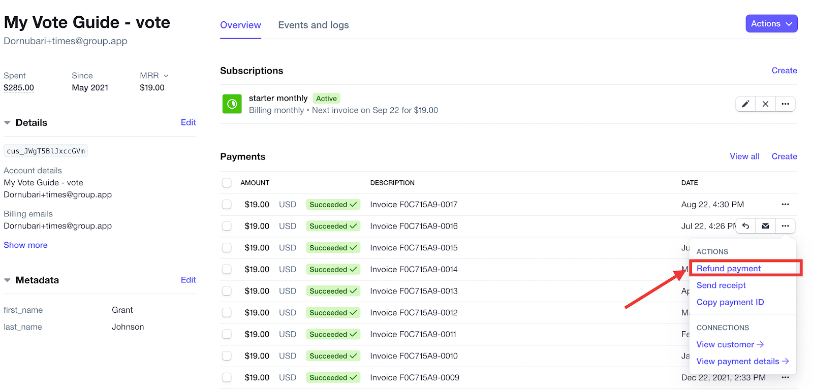 Step 5: Now, find the payment section inside of the billing profile and click on the three-dot icon next to the payment you would like to refund.