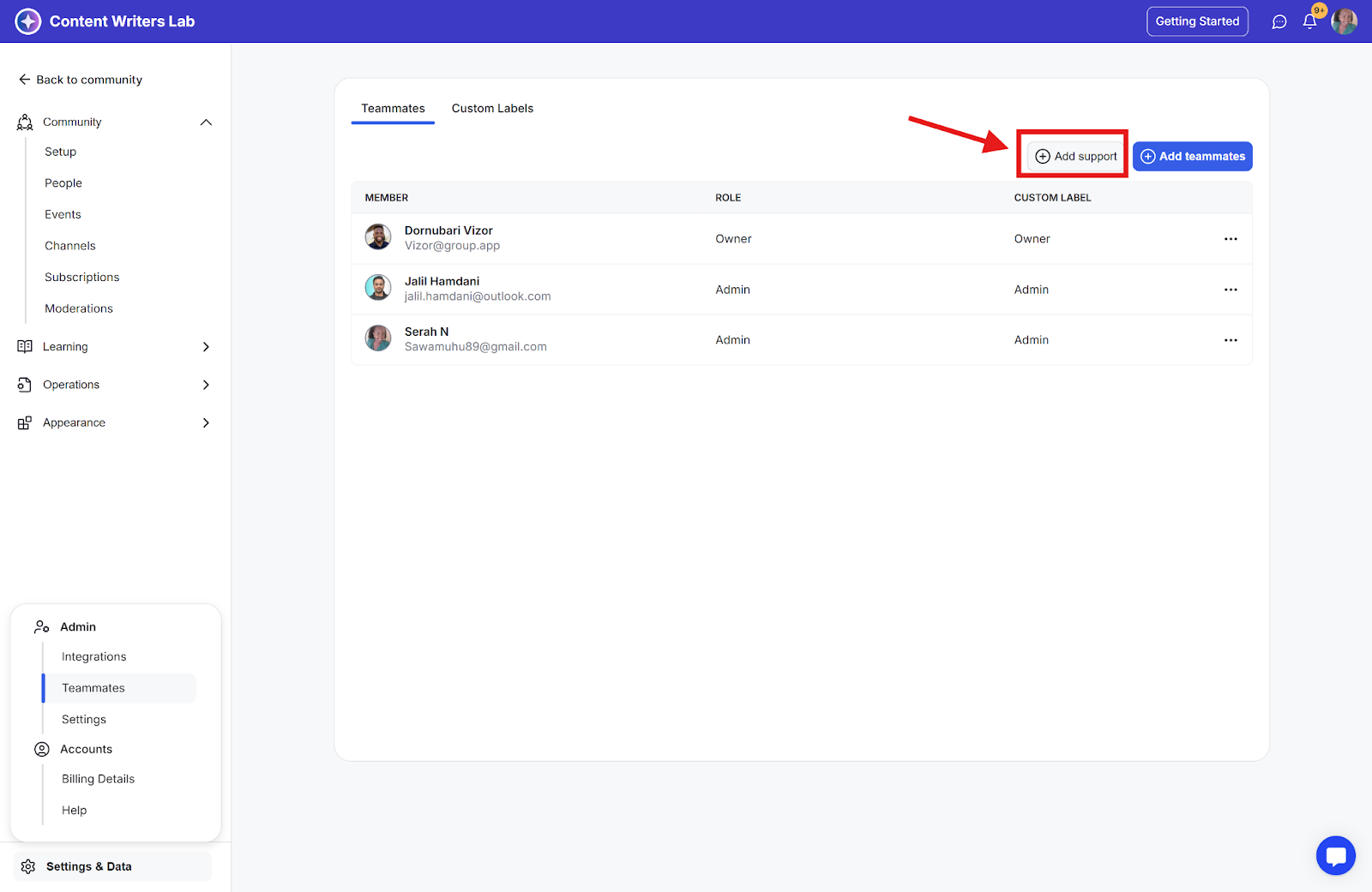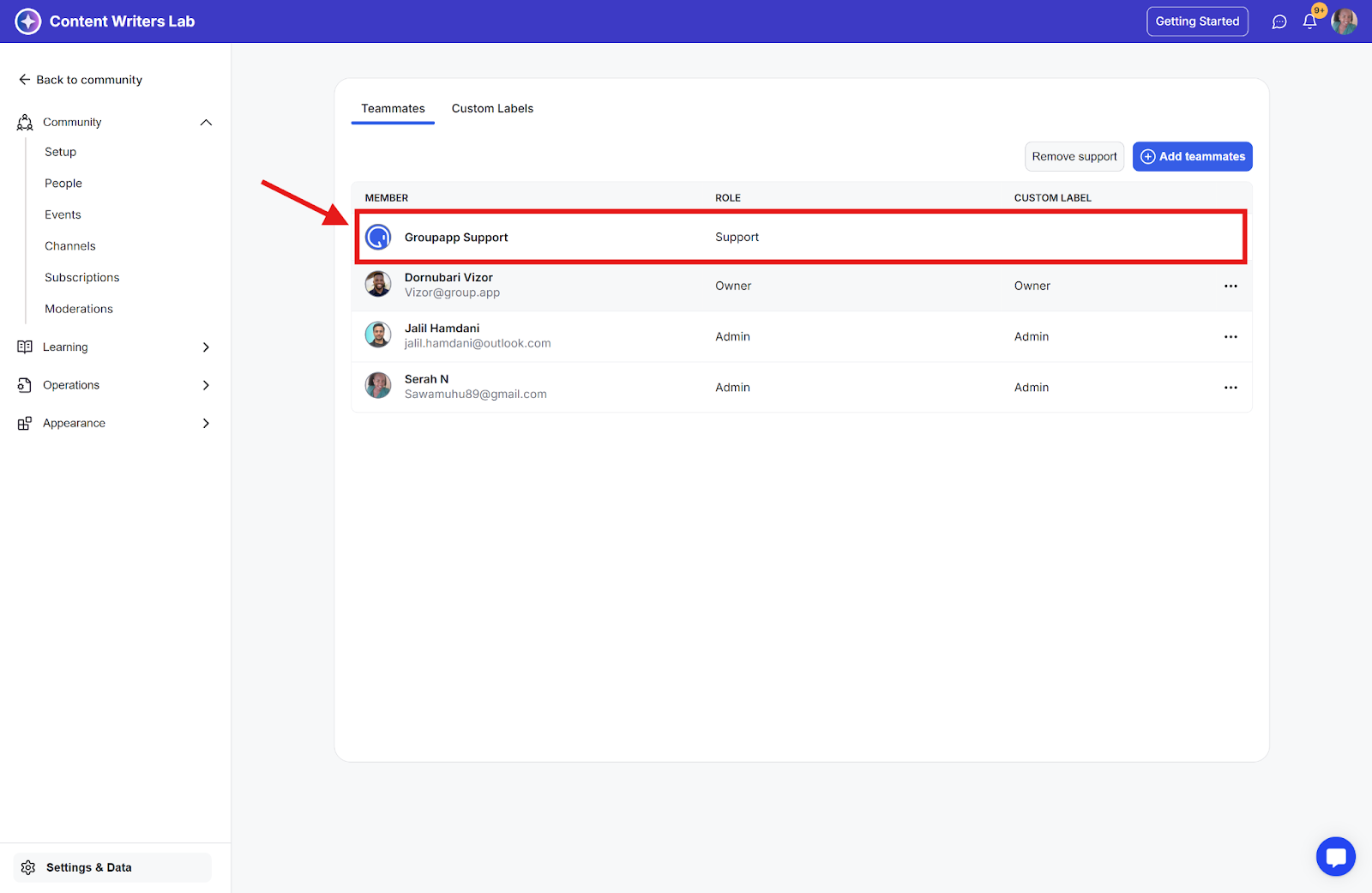 Step 4: Once added, GroupApp Customer Support will appear in your Teammates list and have access to provide support for your community.