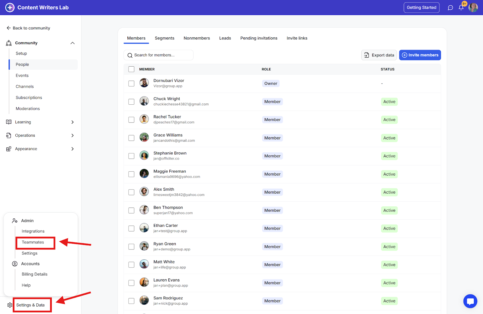 Step 2: Go to Settings & Data at the bottom of the side menu and select Teammates.