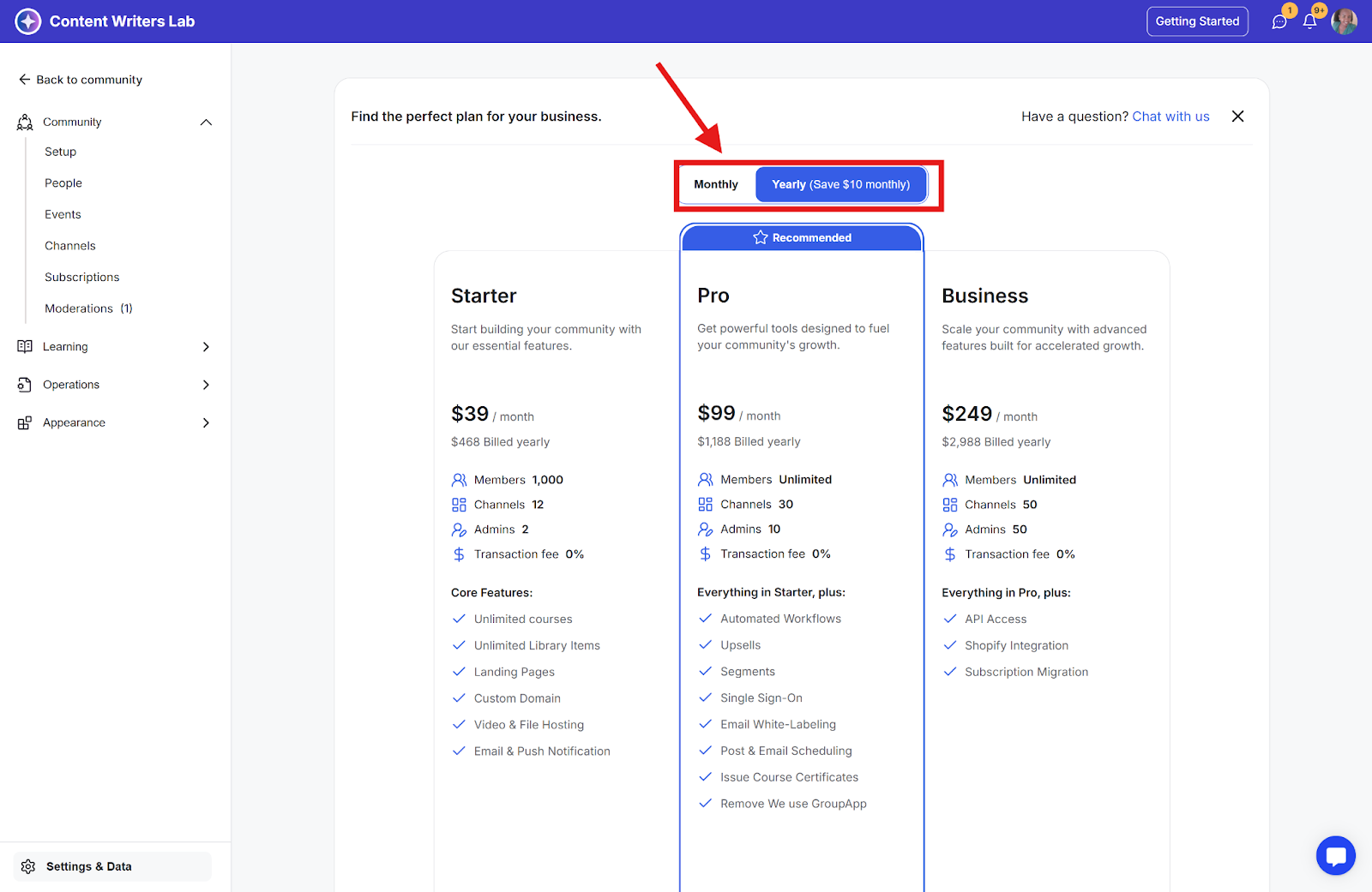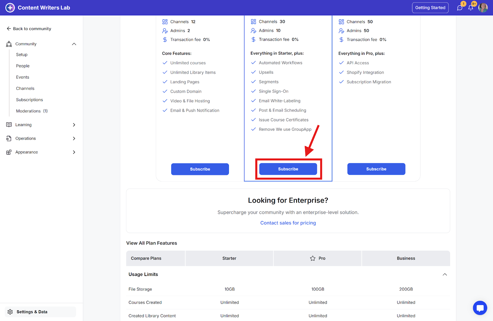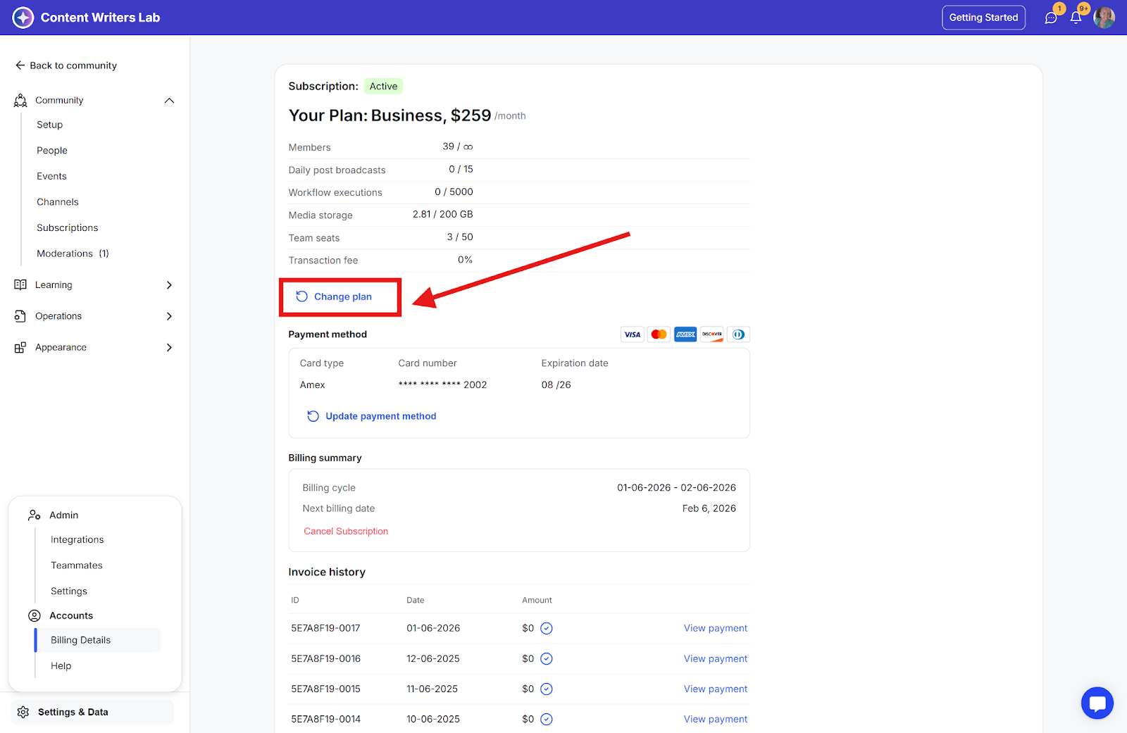 This guide demonstrates how to switch to a different GroupApp subscription plan.