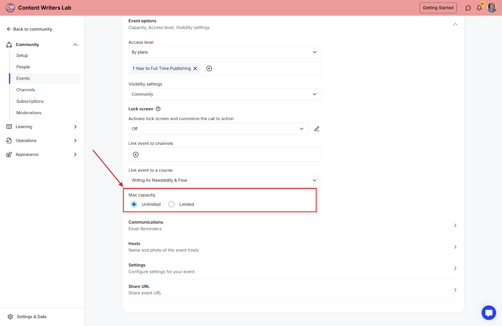 Step 8: Configure the event capacity.
