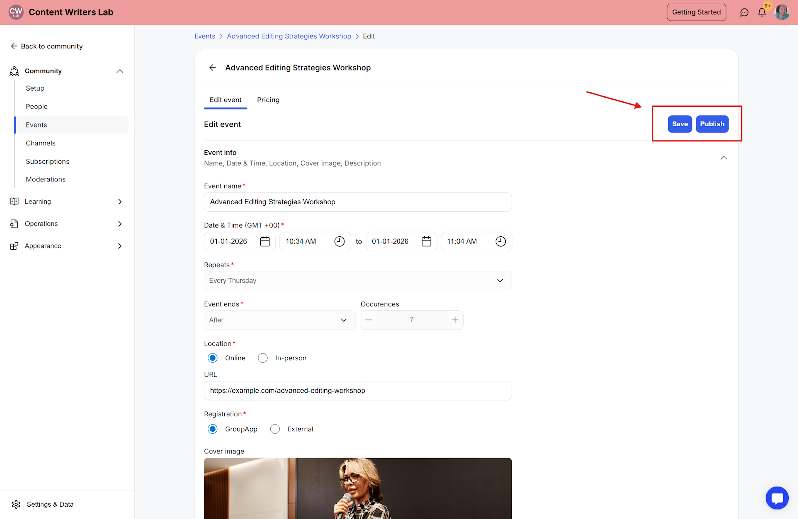 Step 12: Click the Save button and Publish to complete creating the event.