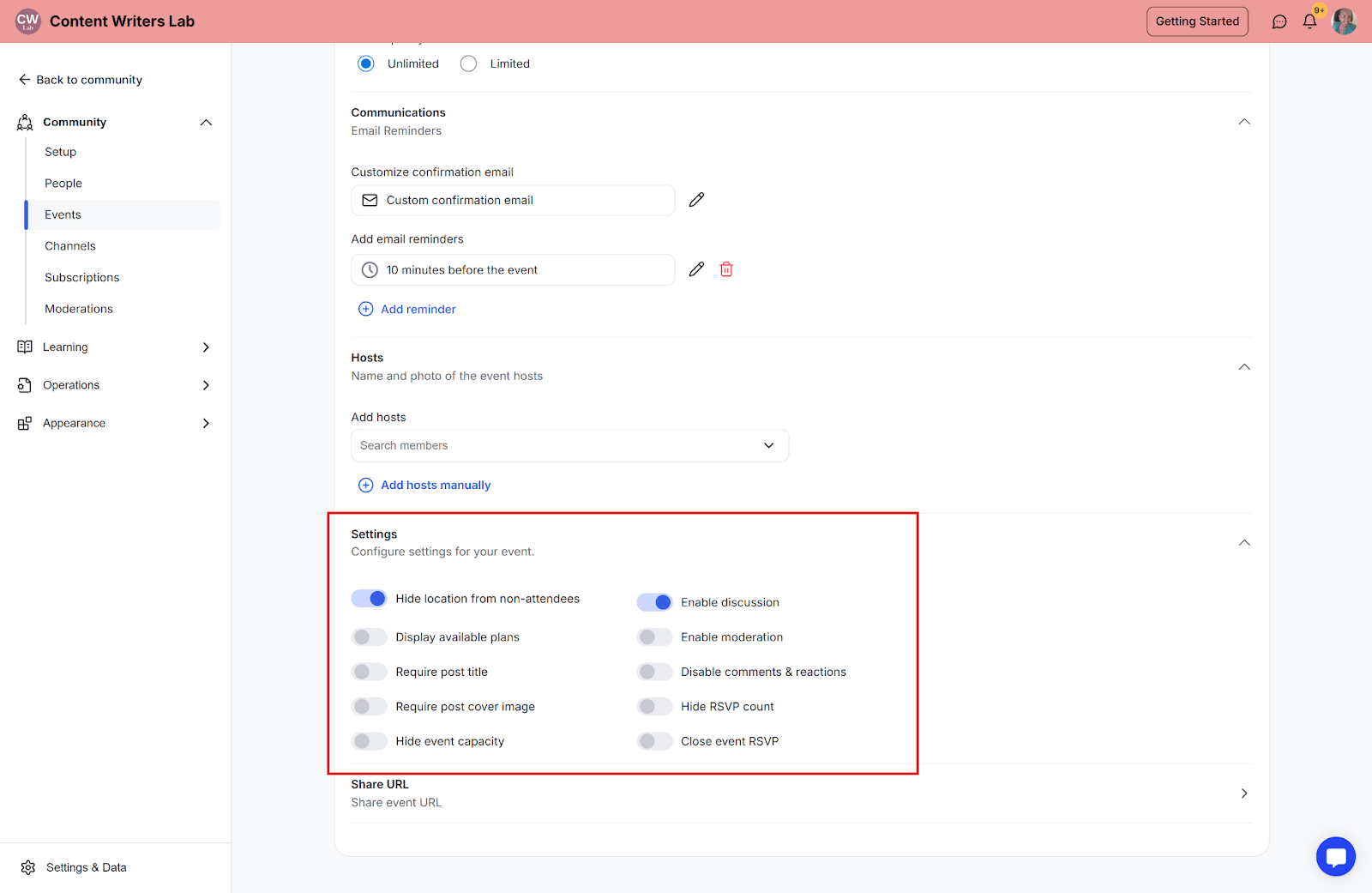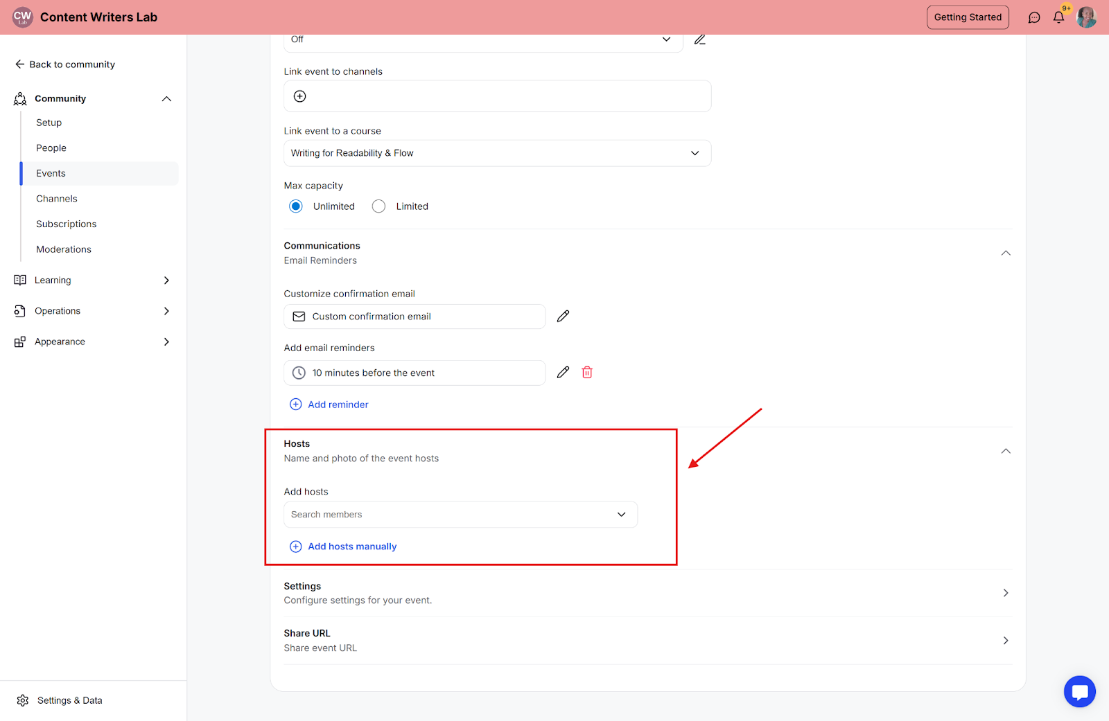 Step 10: Add event hosts: You can select the hosts from the community members list or add them manually by uploading their photos and names