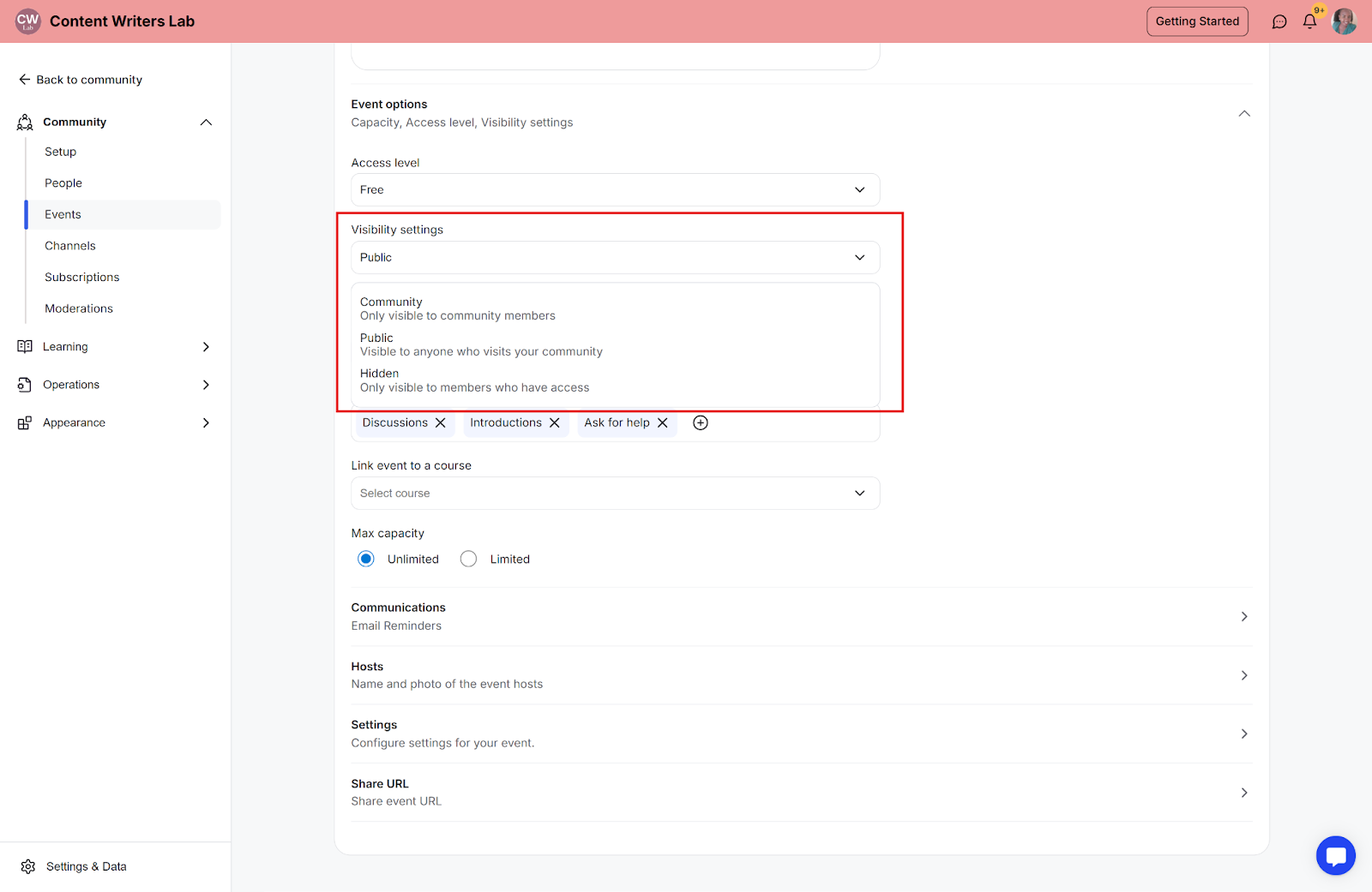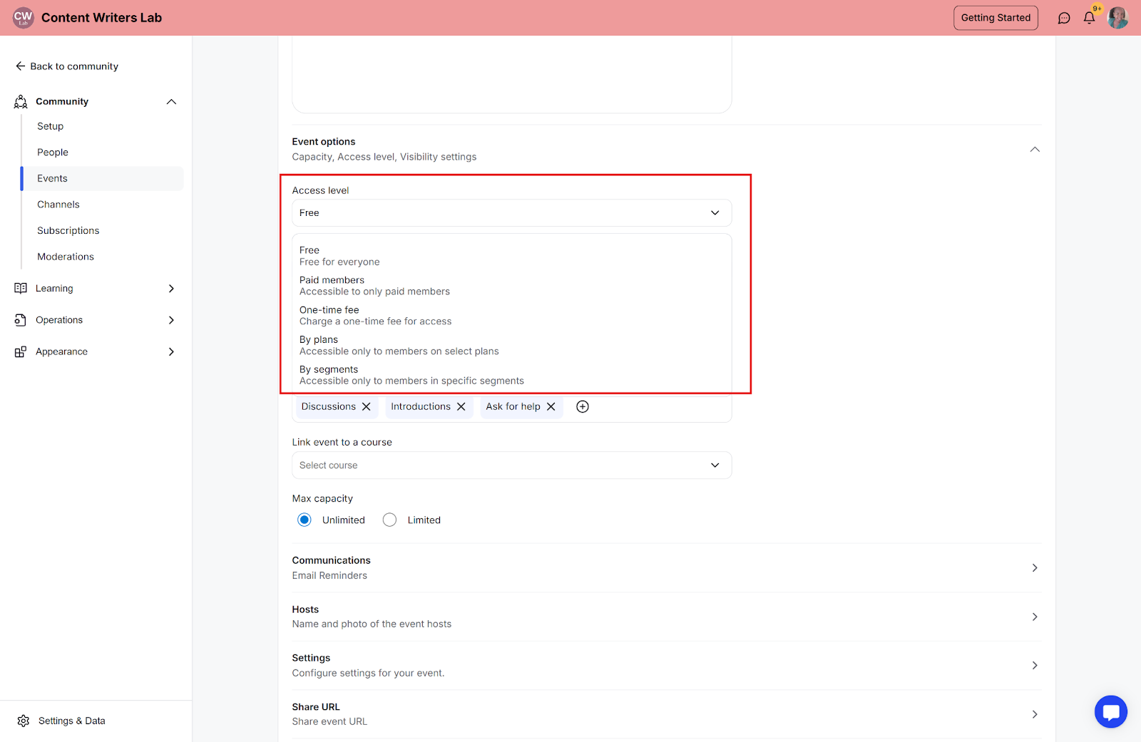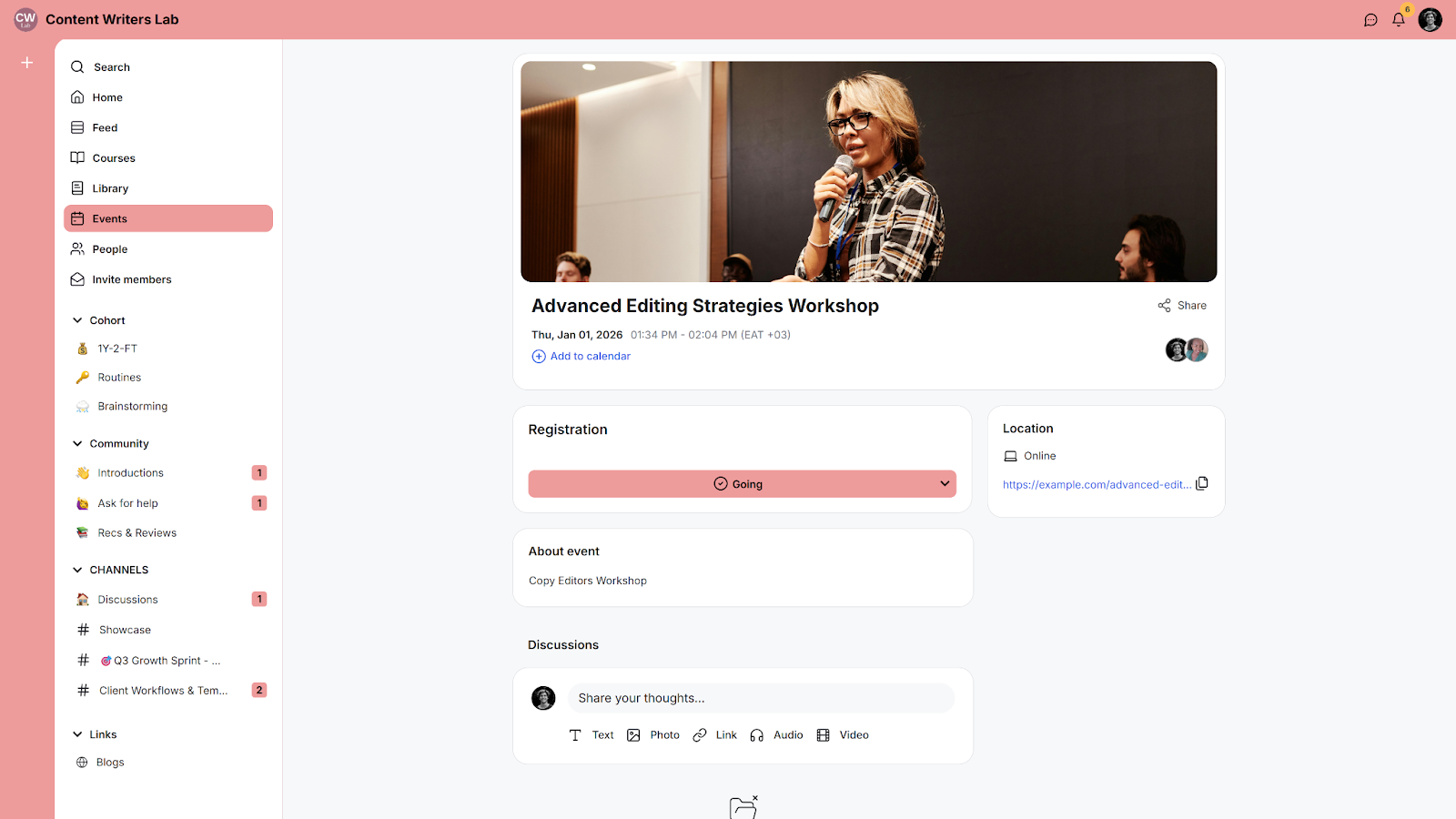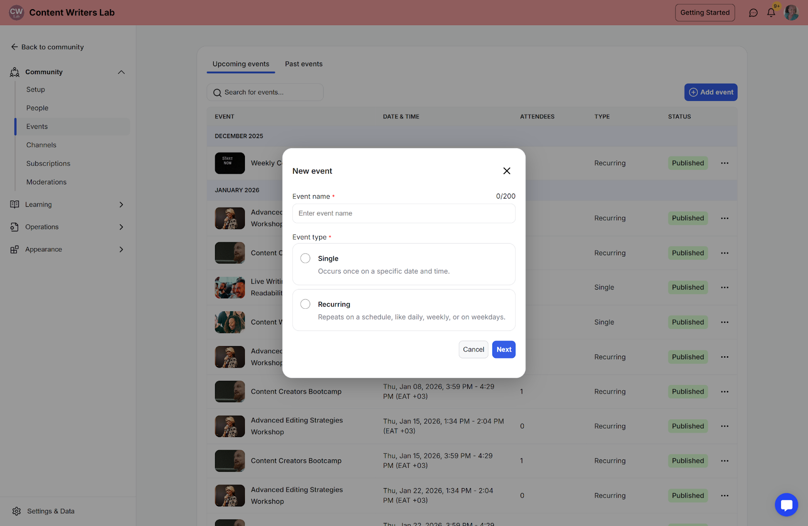 You can create events for coaching sessions, trainings, or meetups directly inside your community. This is a great way to engage with your members and promote your community.