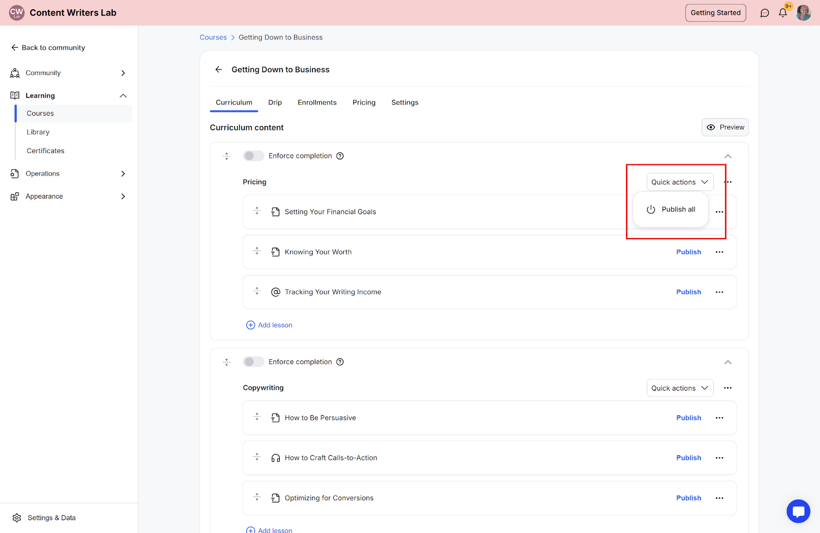 Step 5: To publish all lessons in a specific section, click Quick actions and select Publish all.
