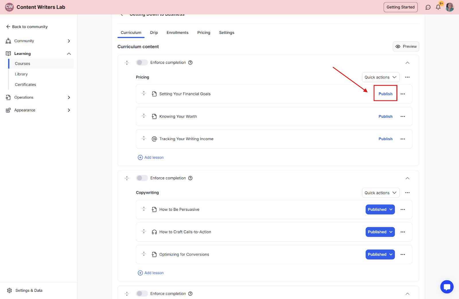 Step 4: Publish the course by publishing its lessons. From the course curriculum, click the Publish button to make lessons go live.