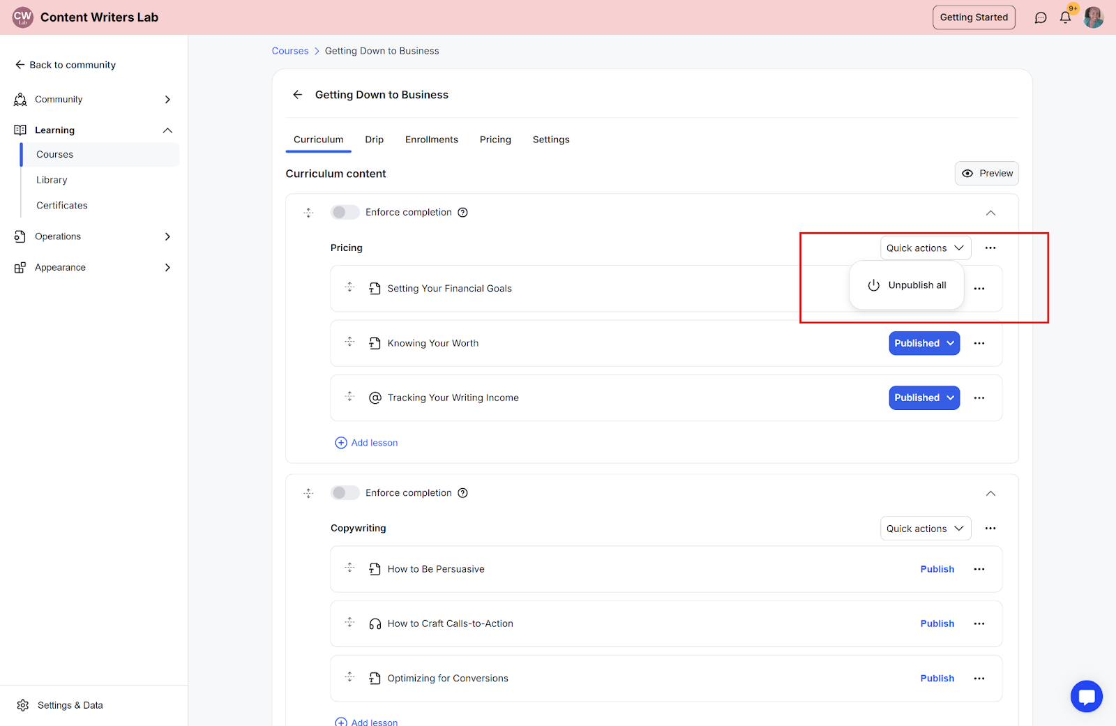 Step 7: To unpublish the entire section, open the course curriculum, click Quick actions, and select Unpublish all.
