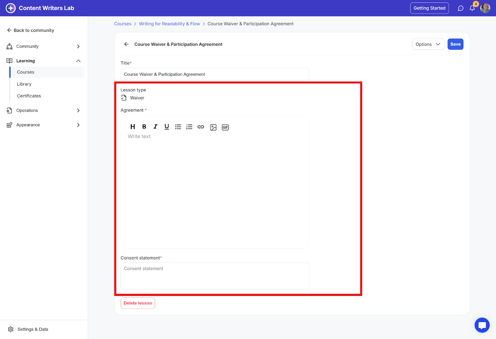 Agreement and consent statements are required for this lesson type.