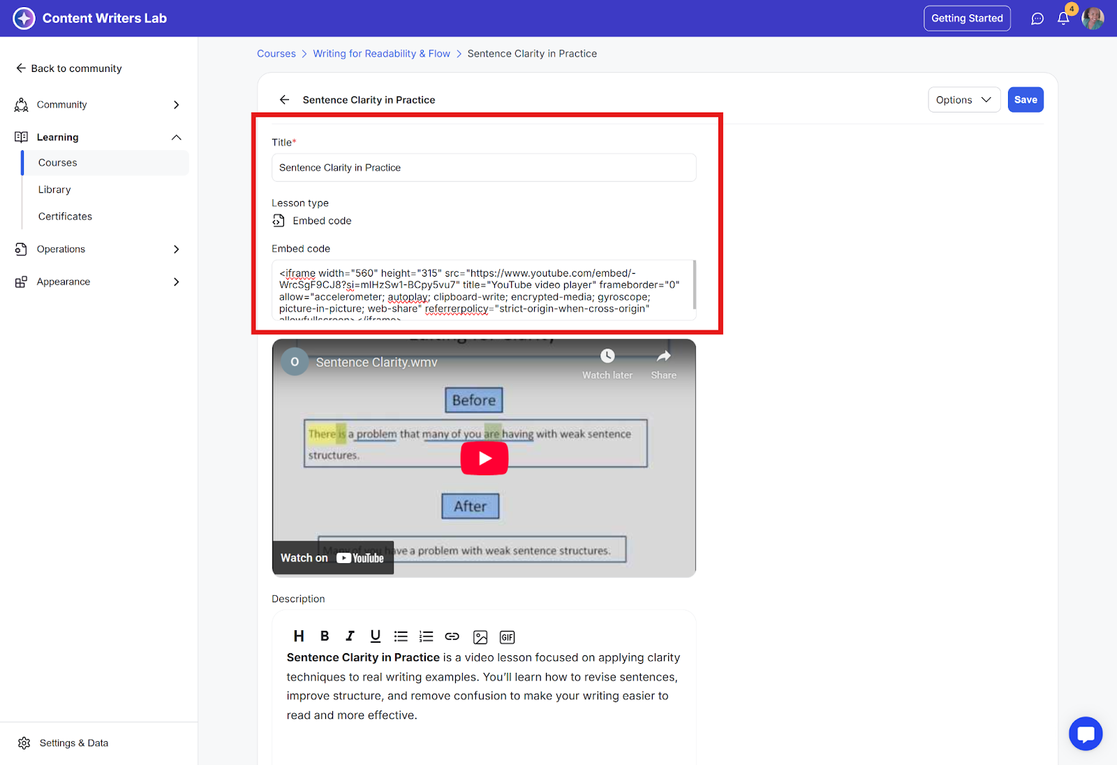What you can do: Add a video from another platform like Vimeo, YouTube, or Wistia as a lesson. You can also include a description to explain the content or provide context.