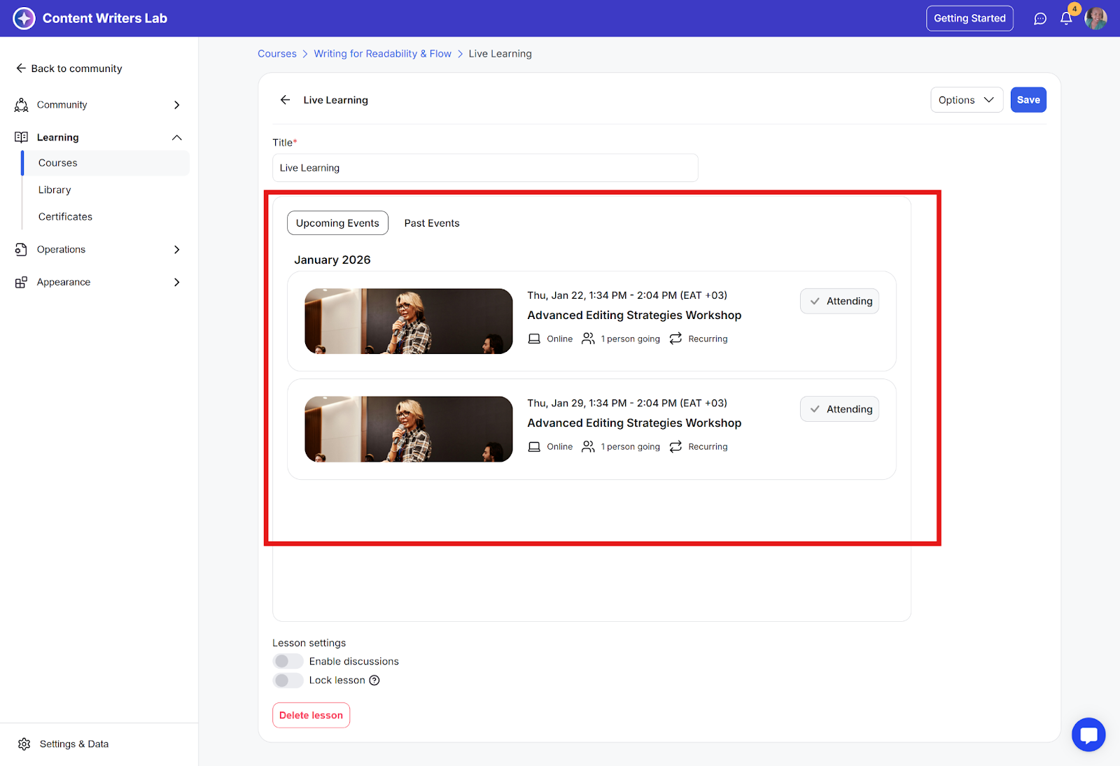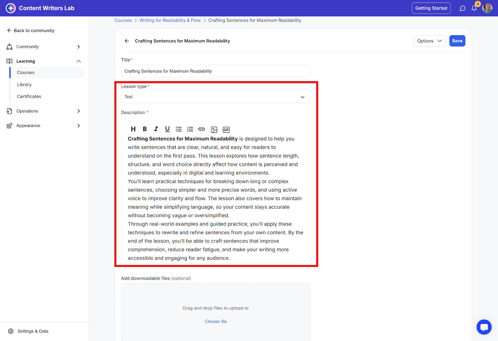 Uploads allowed: You can include downloadable files such as slides, transcripts, or worksheets.