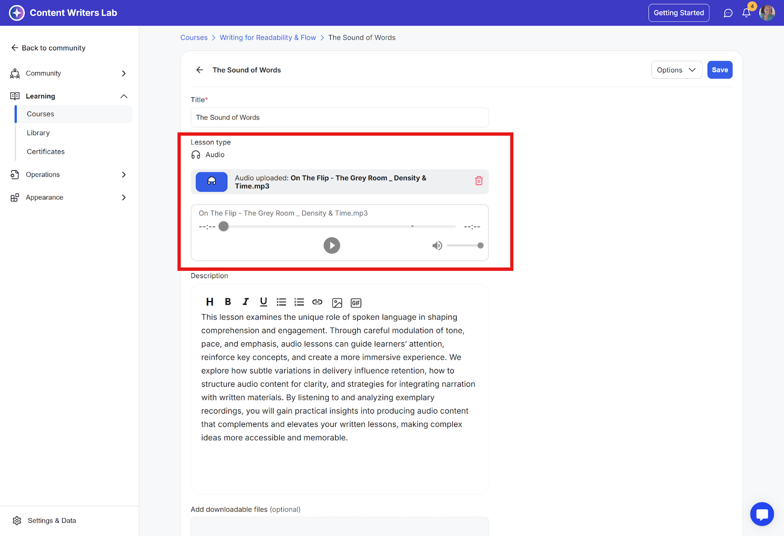 Audio lessons require an audio file upload.