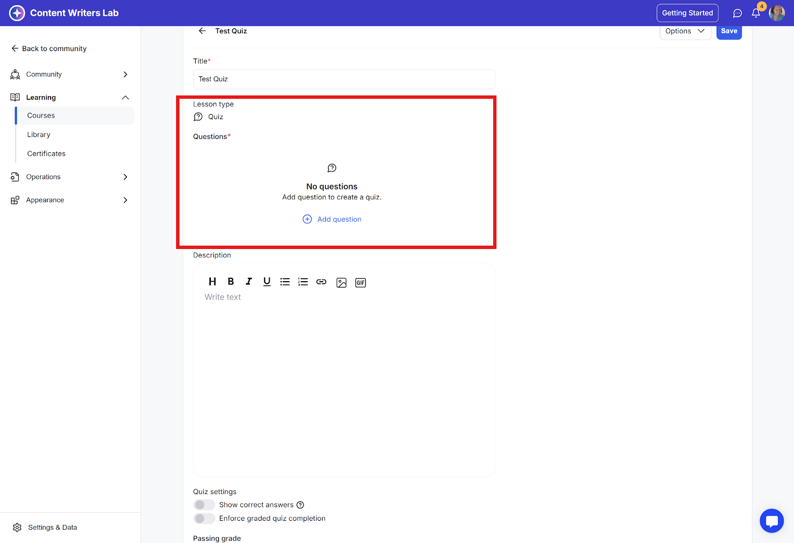 Question setup: Add the question text under the description, then define the answer options. You can specify whether itβs a single correct answer or multiple correct answers.