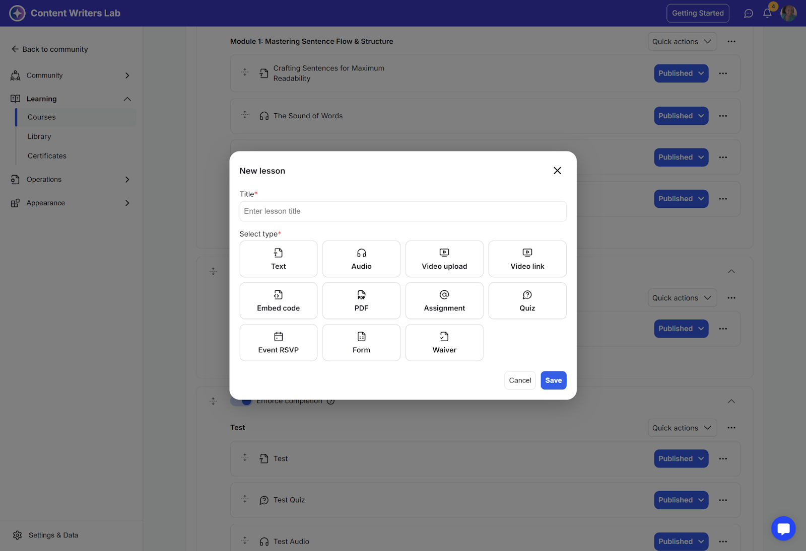 When creating courses, you can choose from eleven lesson types: Text, Audio, Video, Web Video, Embed Code, PDF, Assignment, Quiz, Event, Form, and Waiver.