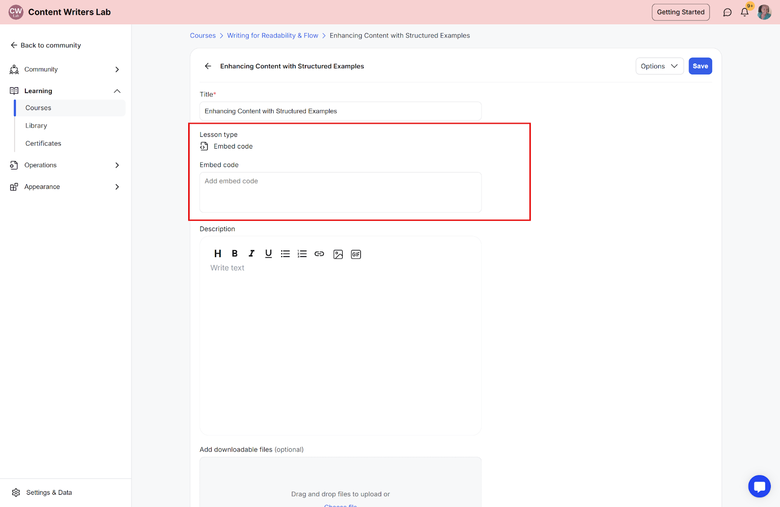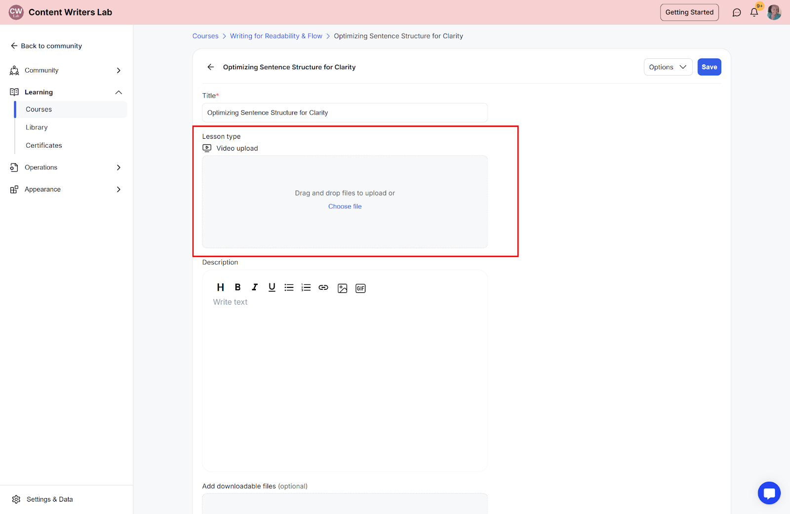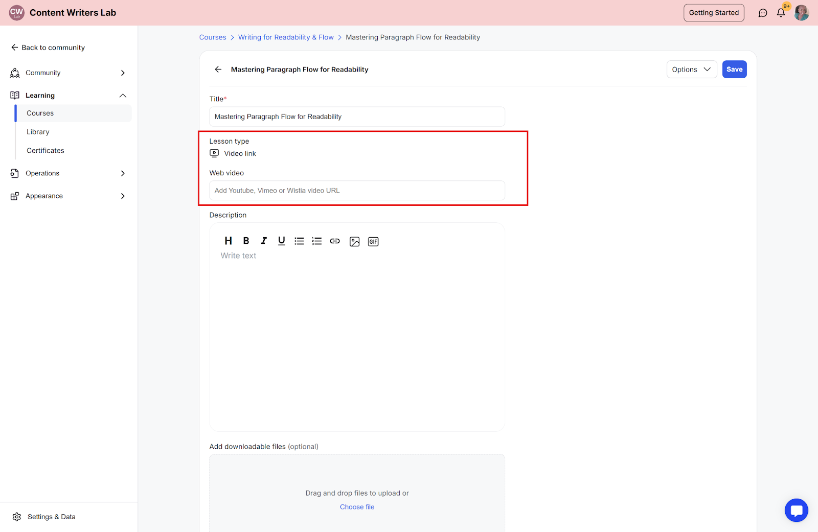 4. Video Link: A video URL (from YouTube, Vimeo, or Wistia) is required for this lesson type.