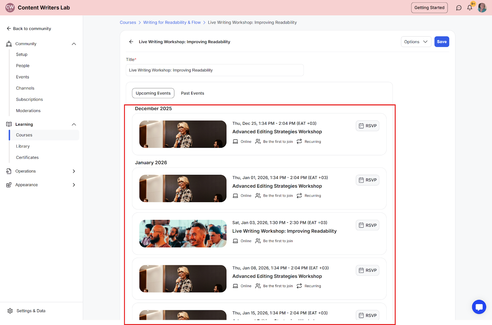 9. Event RSVP: When created, it is automatically populated with all past and upcoming events that are linked to the course.