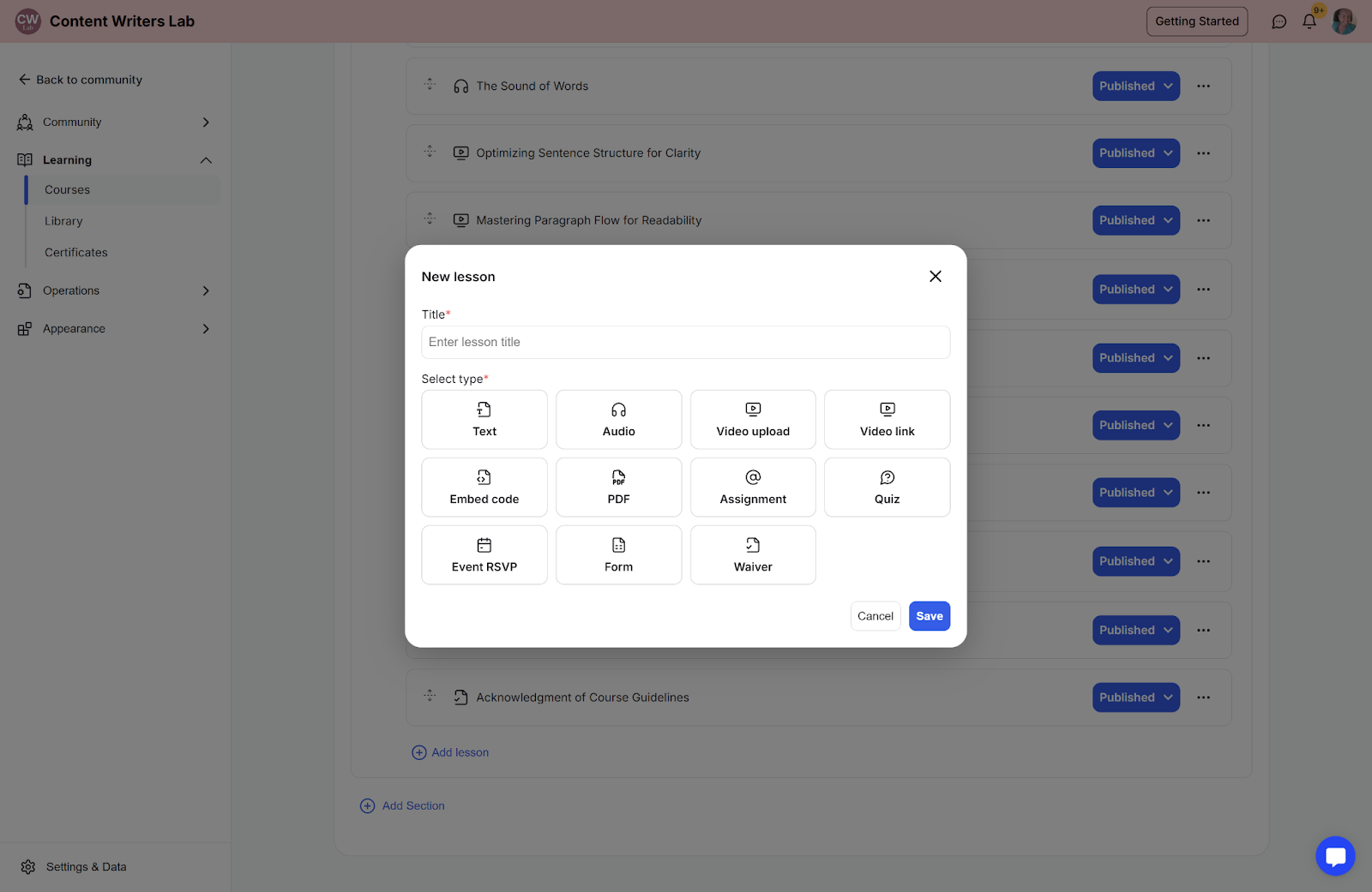 When creating courses, you can choose from eleven lesson types: Text, Audio, Video, Web Video, Embed Code, PDF, Assignment, Quiz, Event, Form, and Waiver.