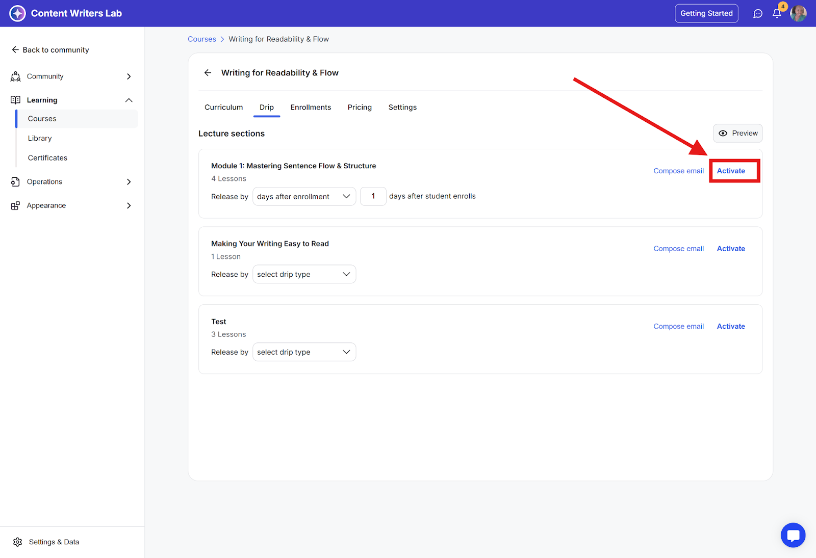 Step 9: Click the Activate button to activate the Drip for this specific course section.