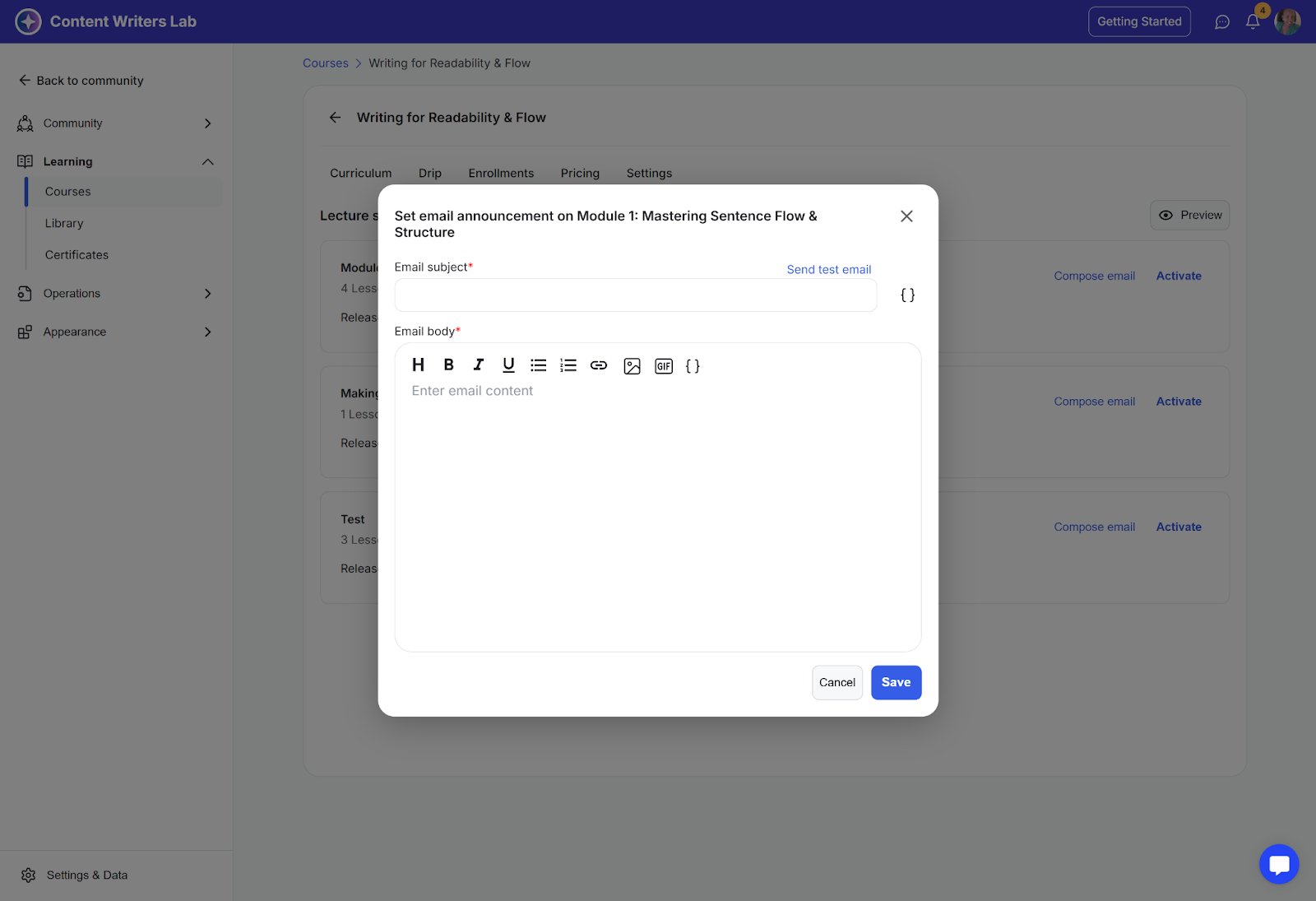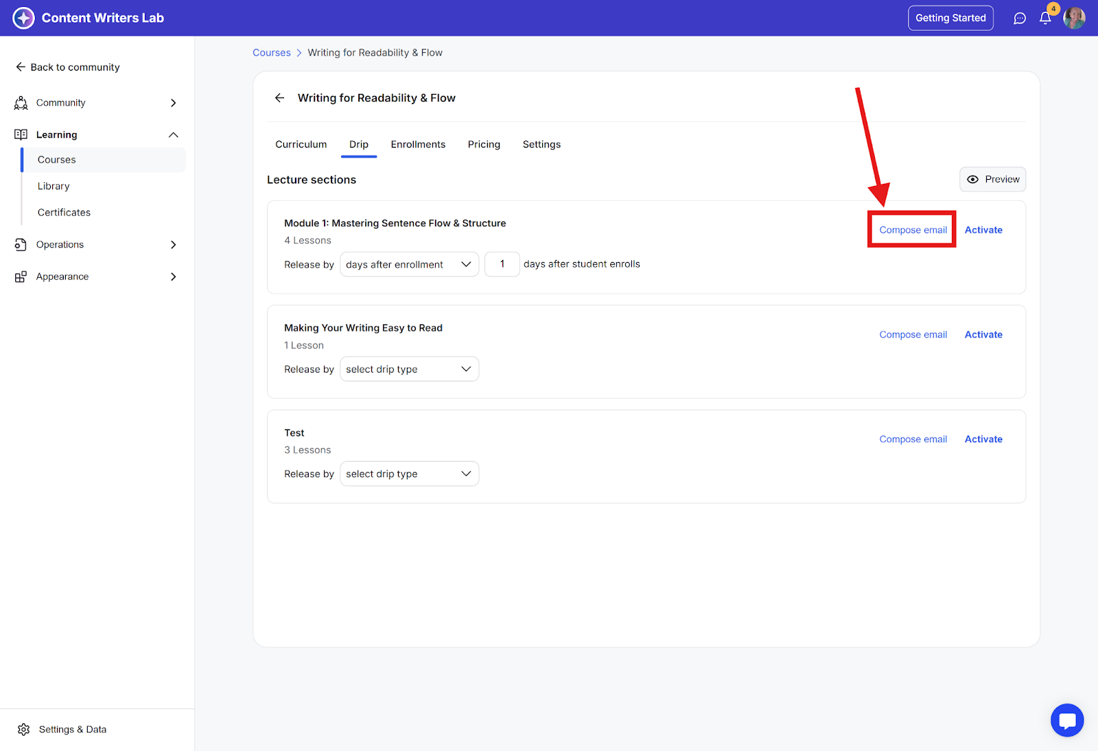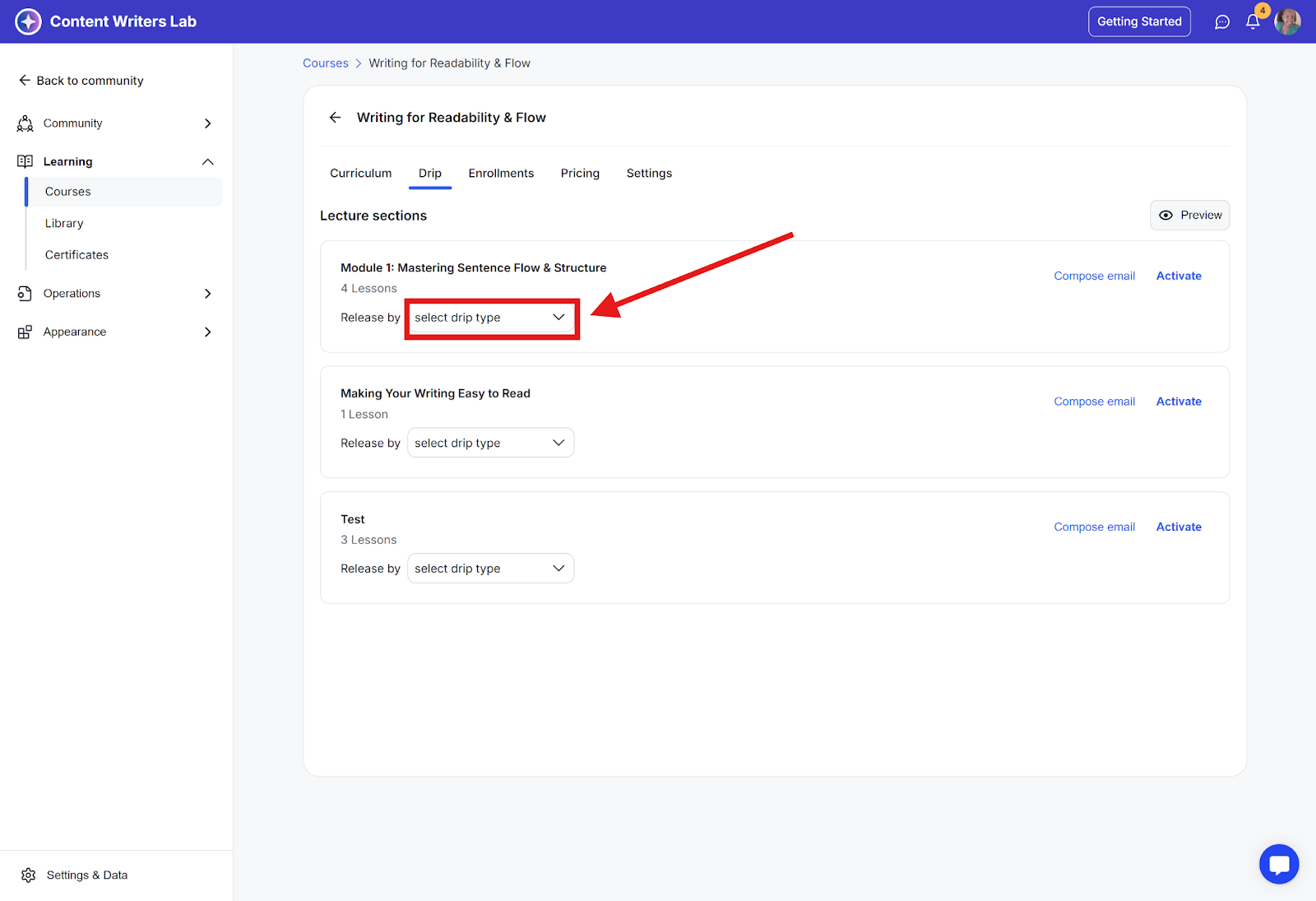 In this guide, you’ll learn how to set up drip schedules and send notifications to learners when new lessons are available.