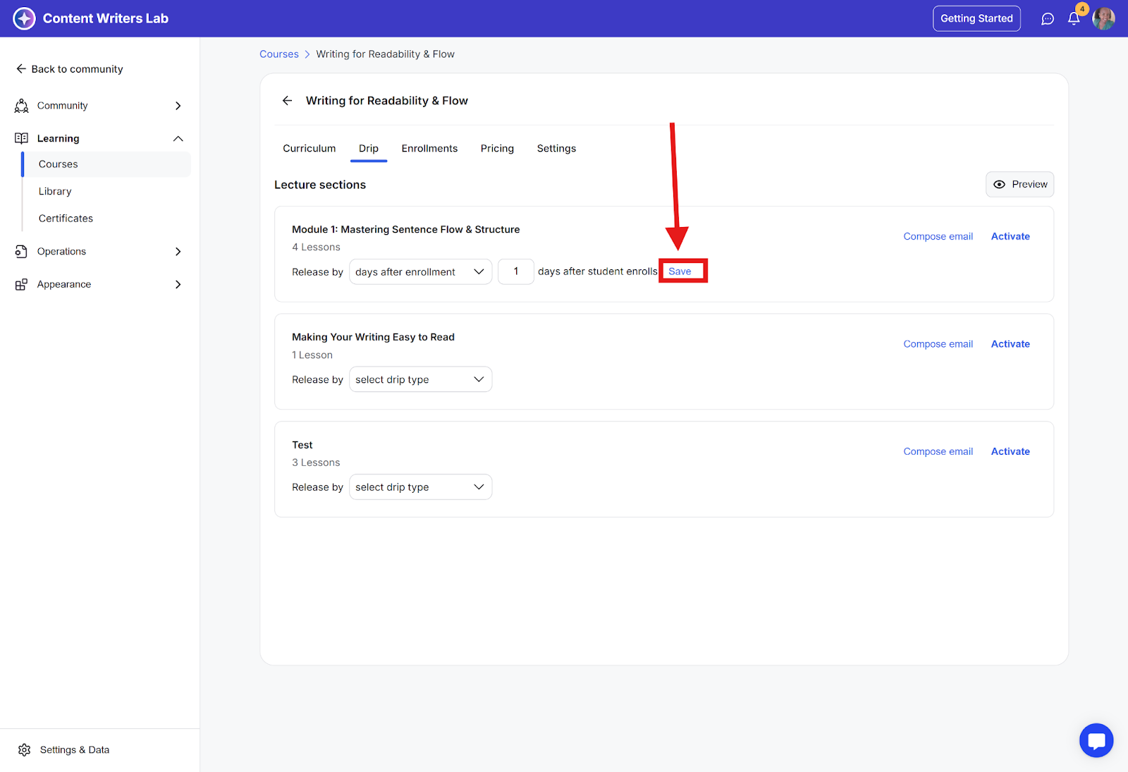 Days after enrollment: You can choose to release course lessons a specific number of days after the enrollment day. Enter the number of days and click Save.