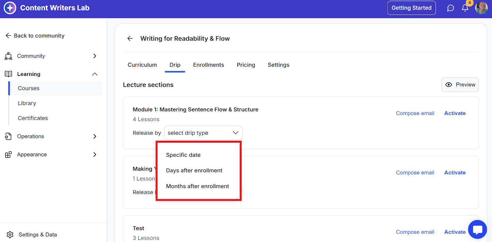 Course Drip allows you to schedule when lessons or sections of your course become available to learners. This feature helps you deliver content at the right pace, keep learners engaged, and guide them through the material.