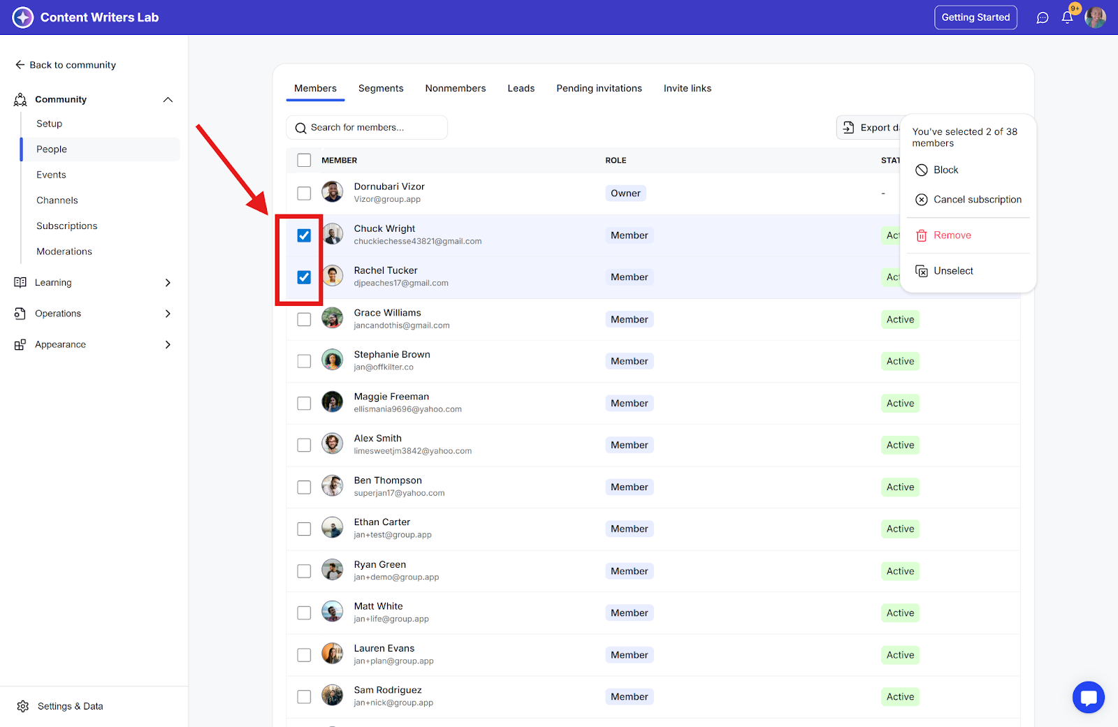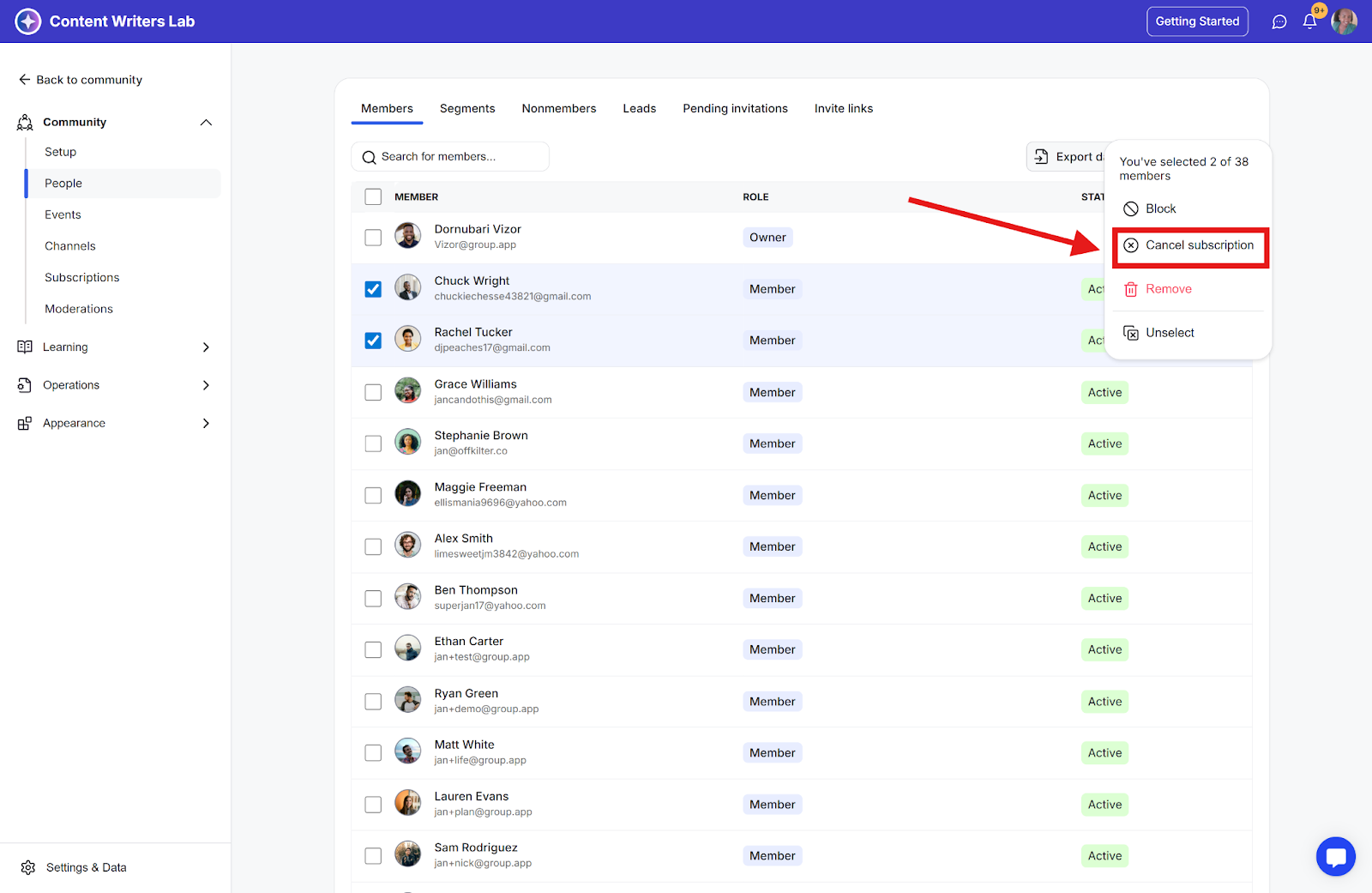 Step 3: On the member’s page, locate the specific people you want to cancel their subscription and tick the corresponding checkboxes.