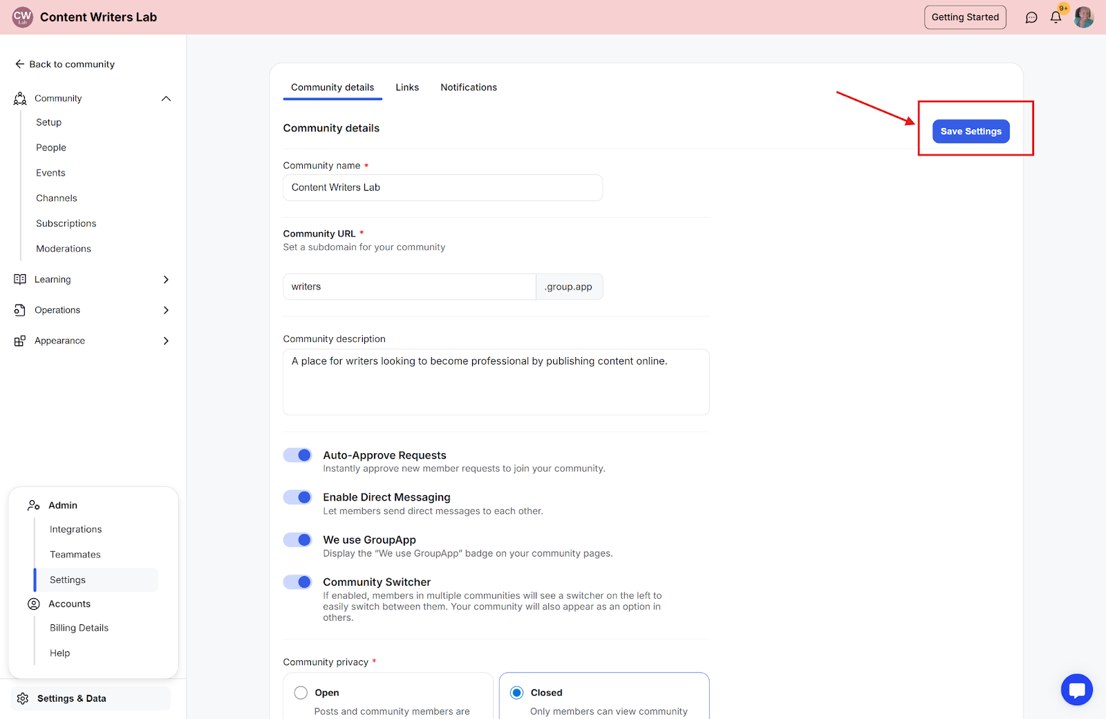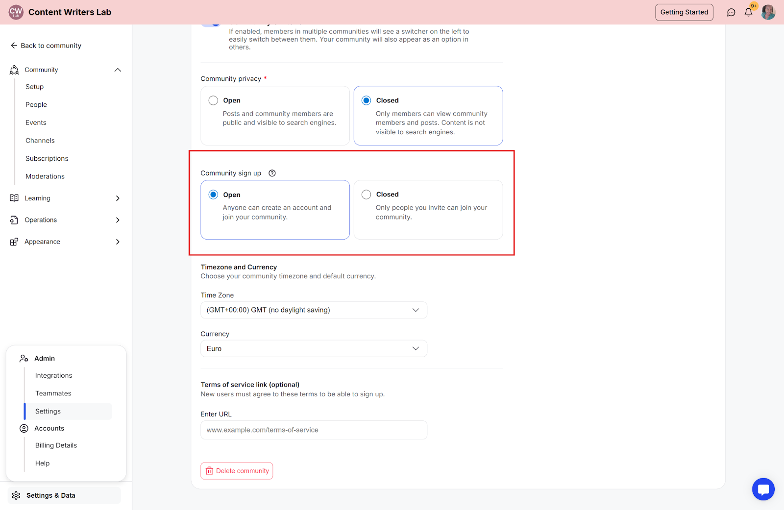 You can control who is allowed to join your community by disabling open sign-ups. This setting helps you limit access, invite members manually, or allow sign-ups only through specific links.