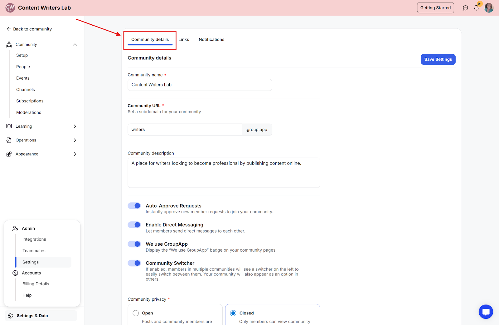 Step 3: You will land on the Community Details tab.