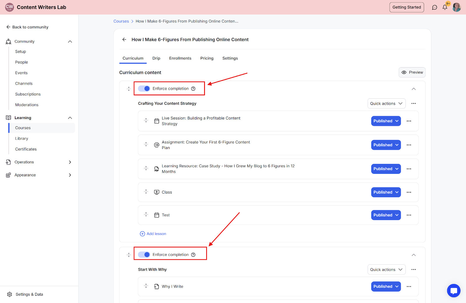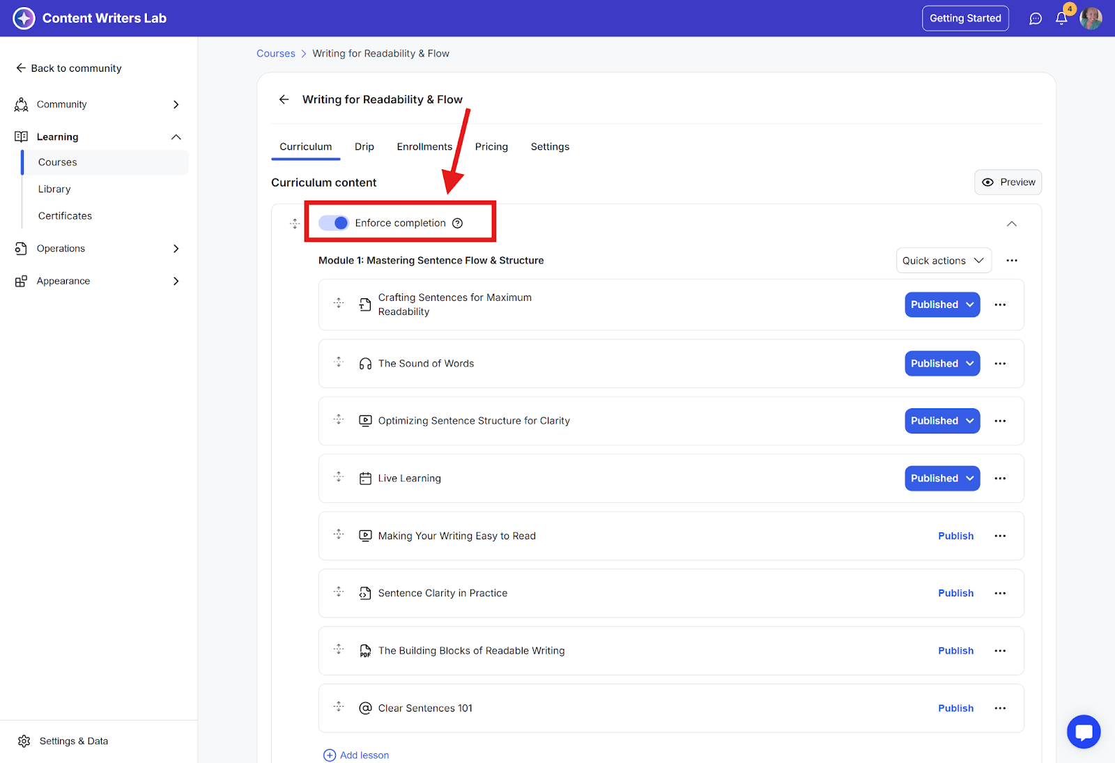 Step 3: Check the Enforce Completion toggle. You’ll need to turn on the toggle separately for each module.