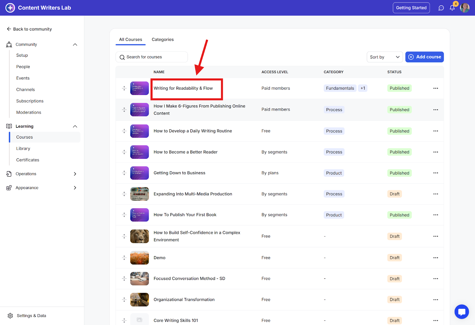 Step 2: Click on Learning in the side menu, then select Courses. Then, click on the course you want to enforce completion on.