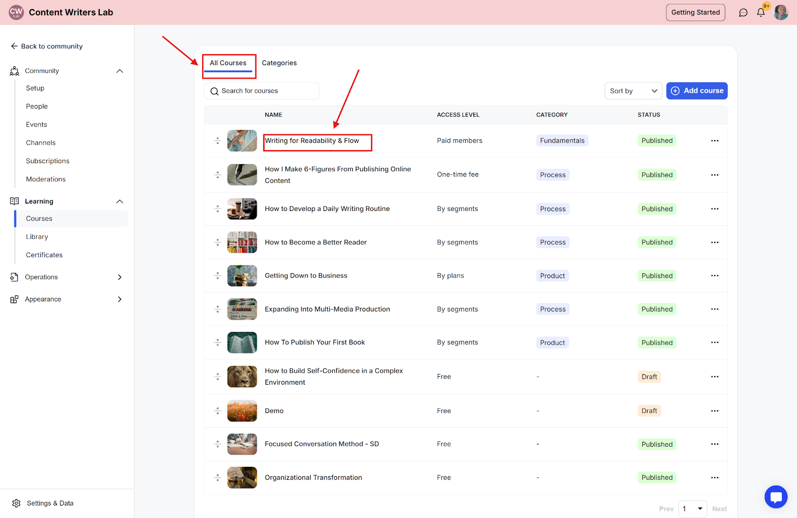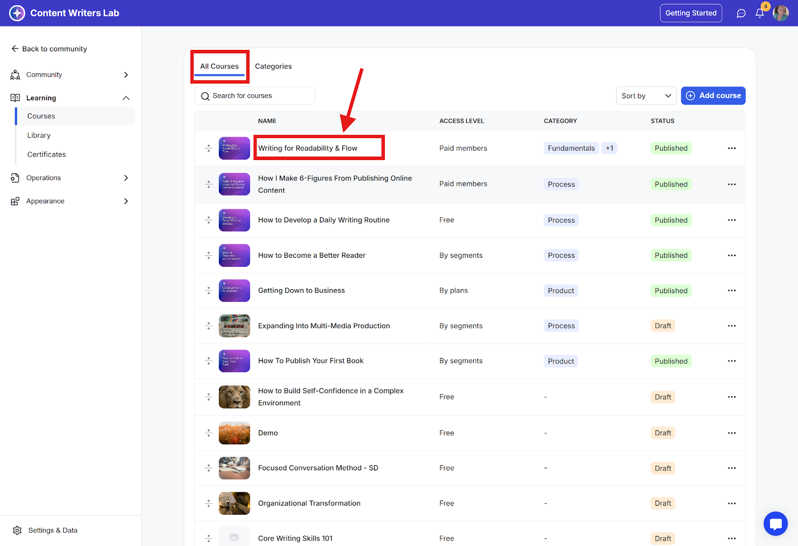 Step 1: Go to the All Courses tab and click on the course you want to edit.