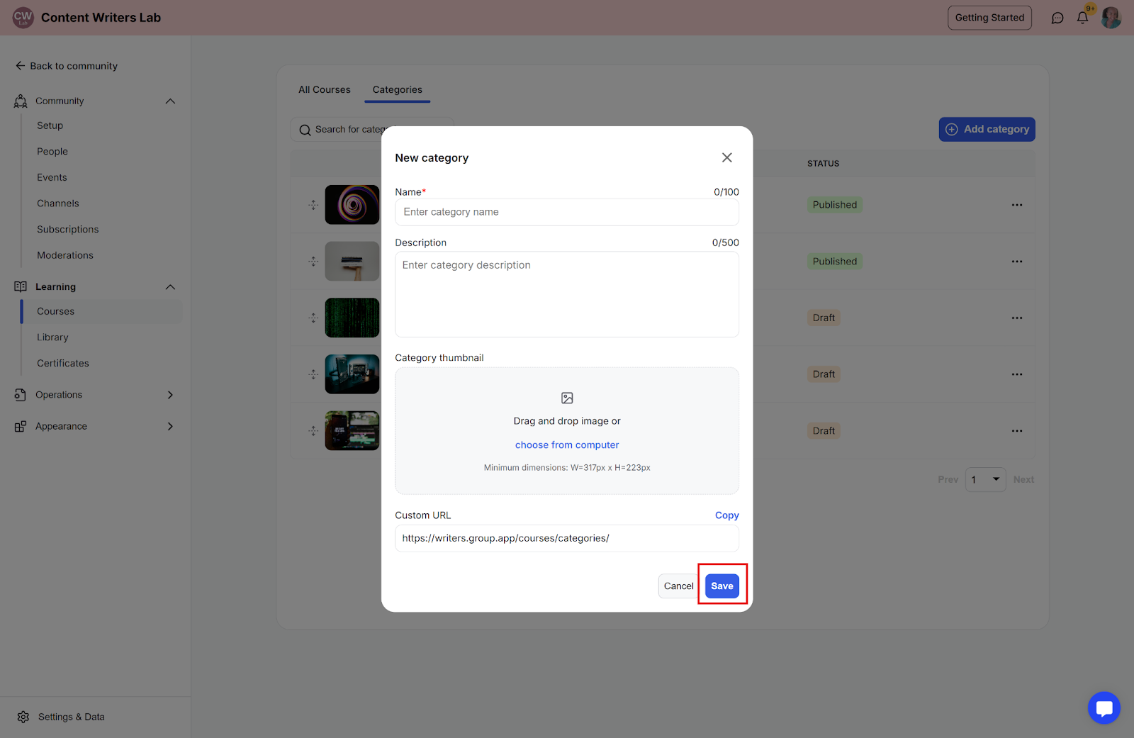Step 4: Complete the category details (name, description, thumbnail) and click the Save button.