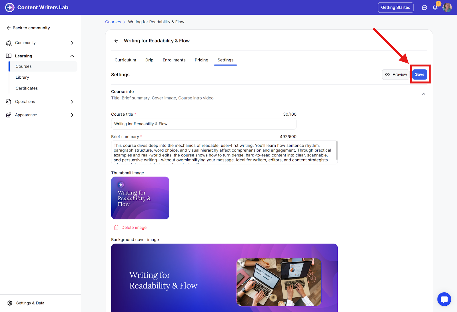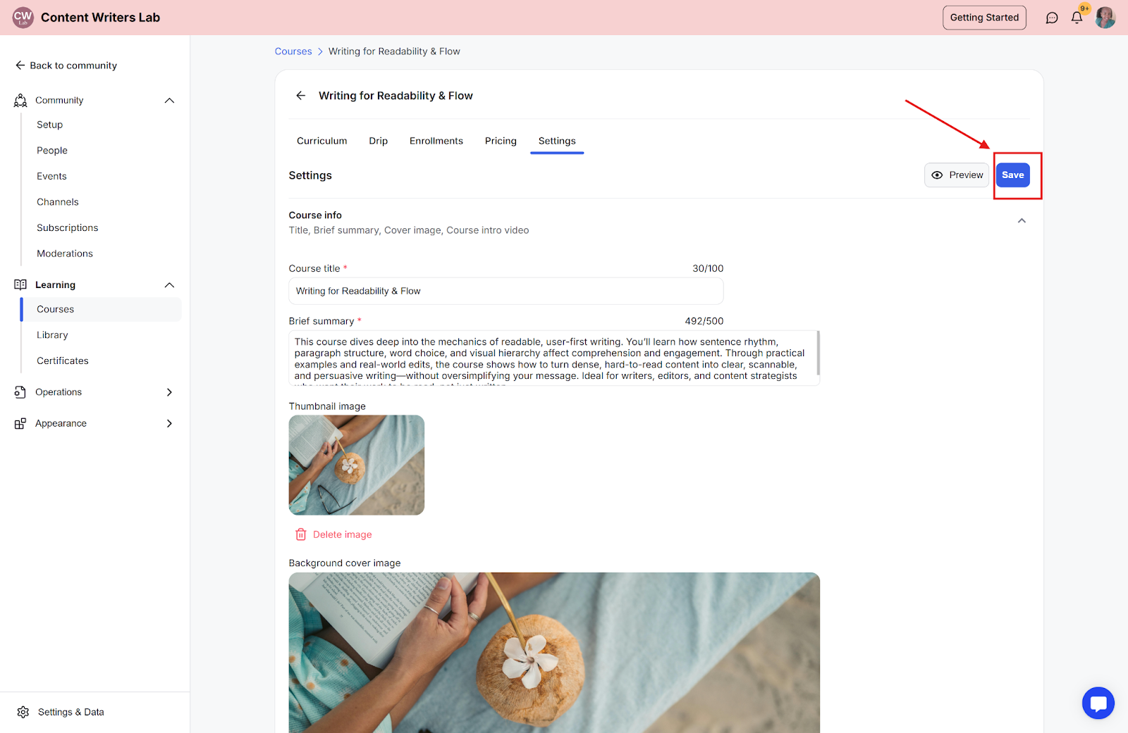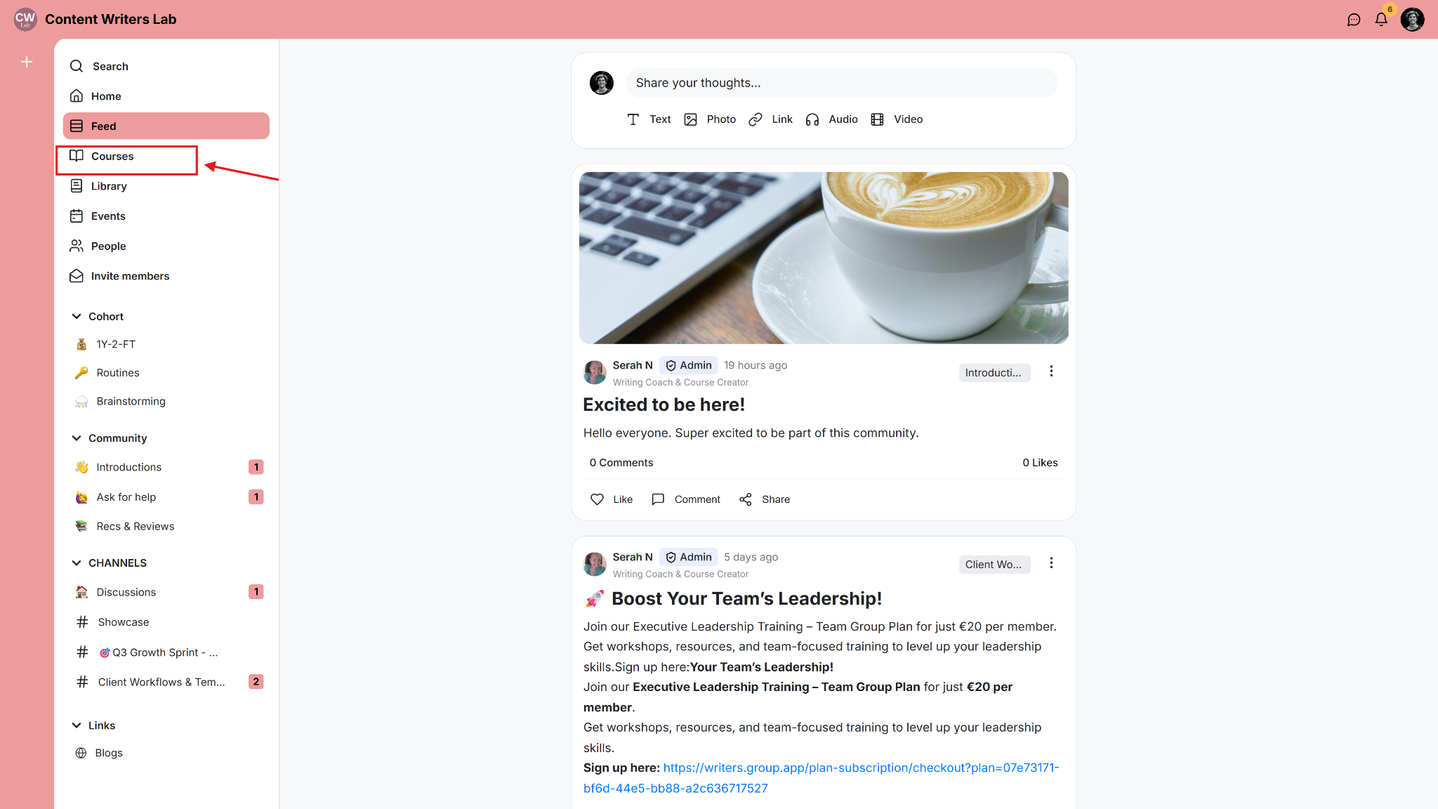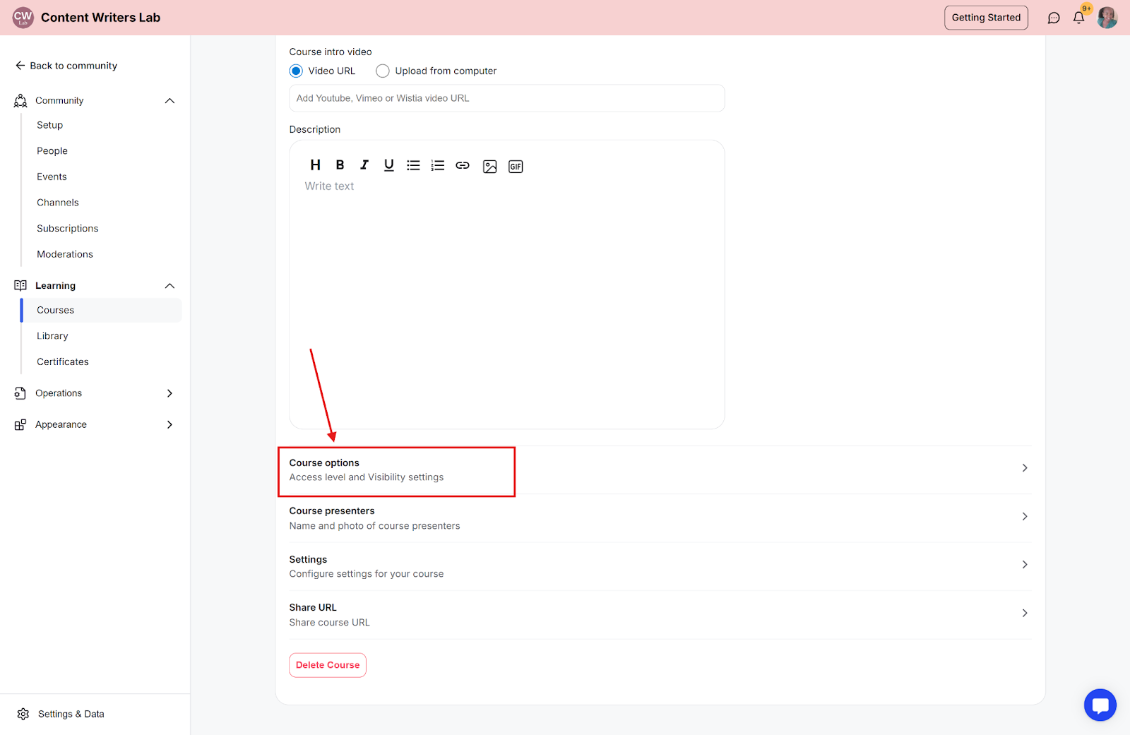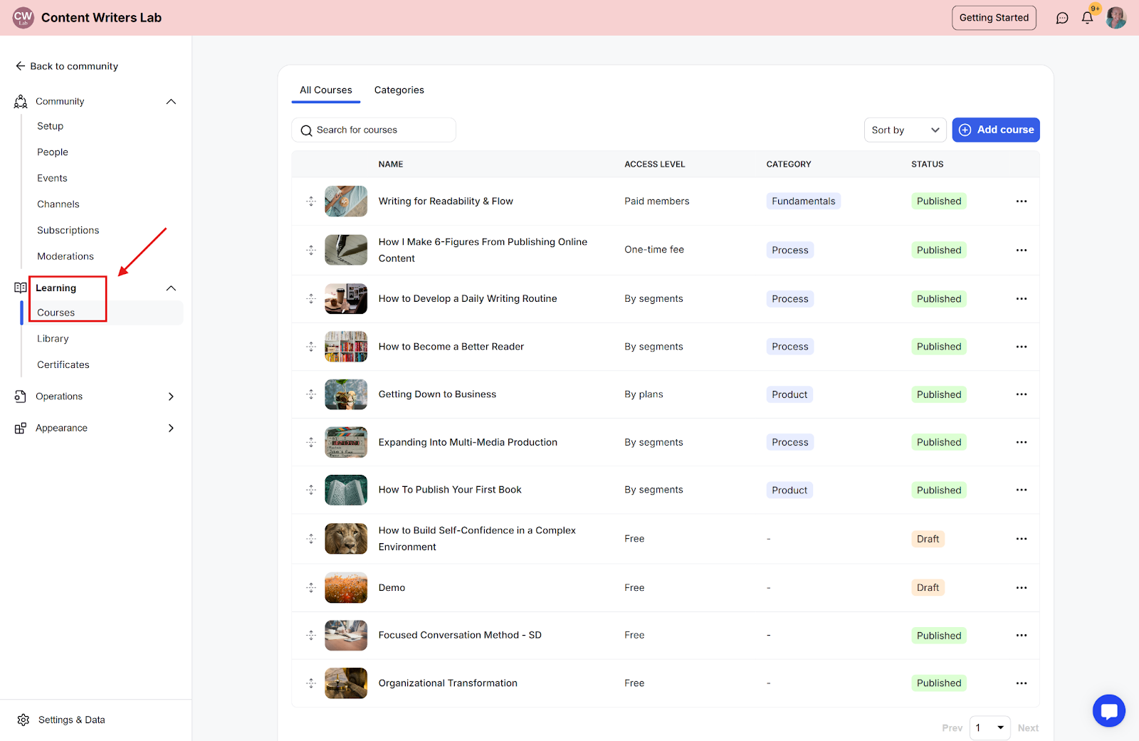 Step 2: Click Learning on the side menu and select Courses.