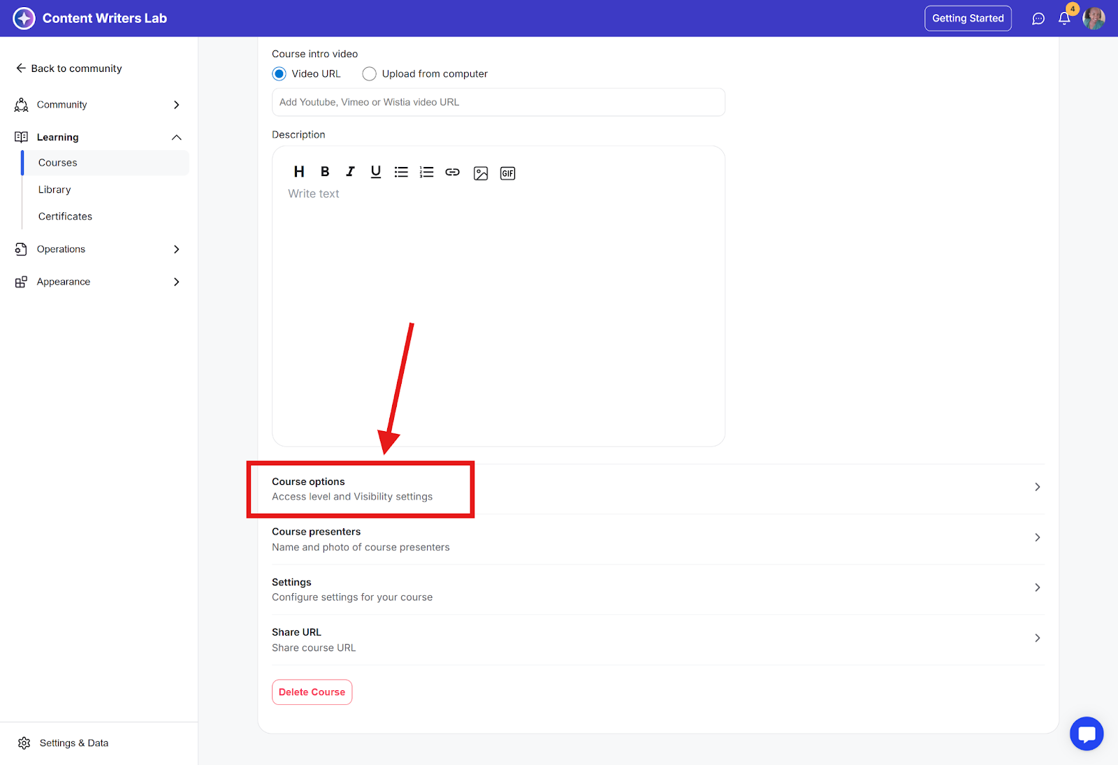 Step 2: Once inside the course edit mode, click on the Settings tab and navigate to the bottom Course Options.