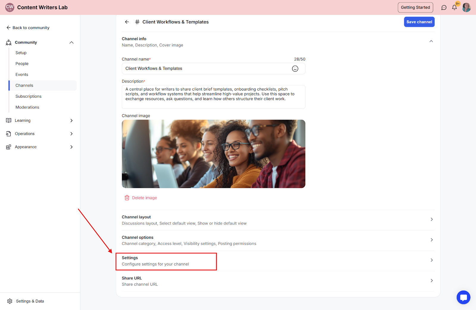 Step 4: Scroll down to Settings in the Edit Channel page and open it.