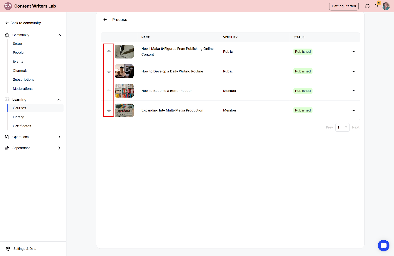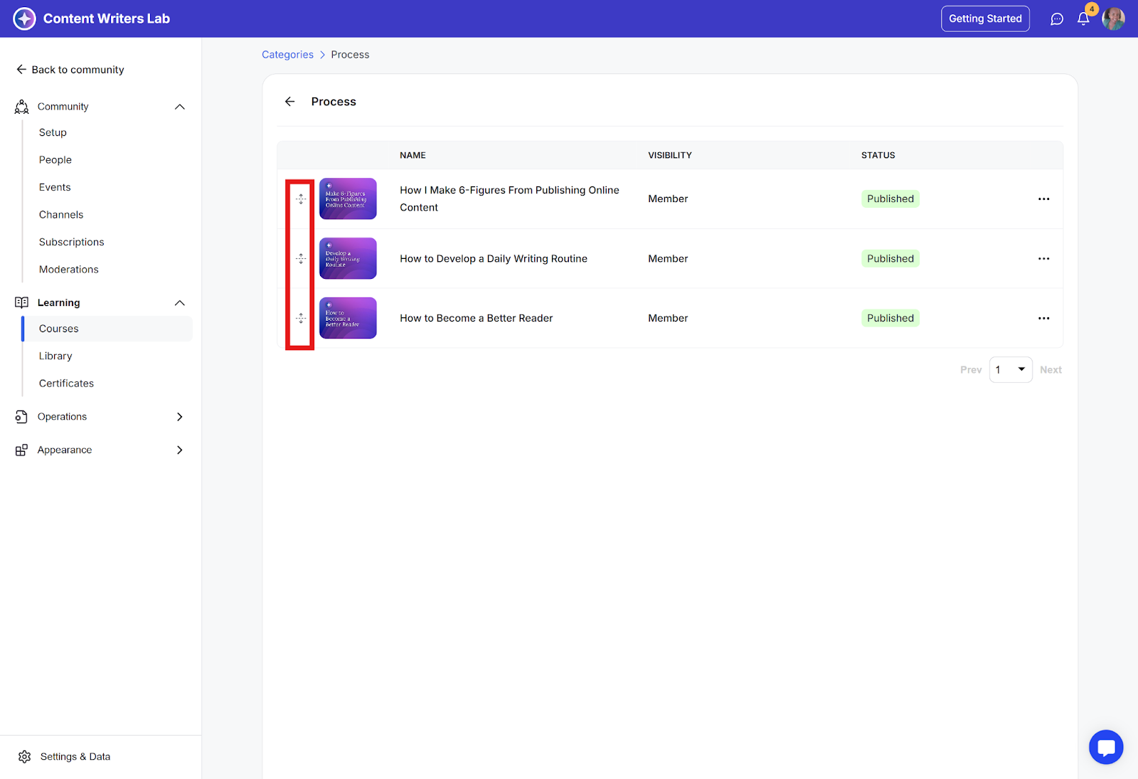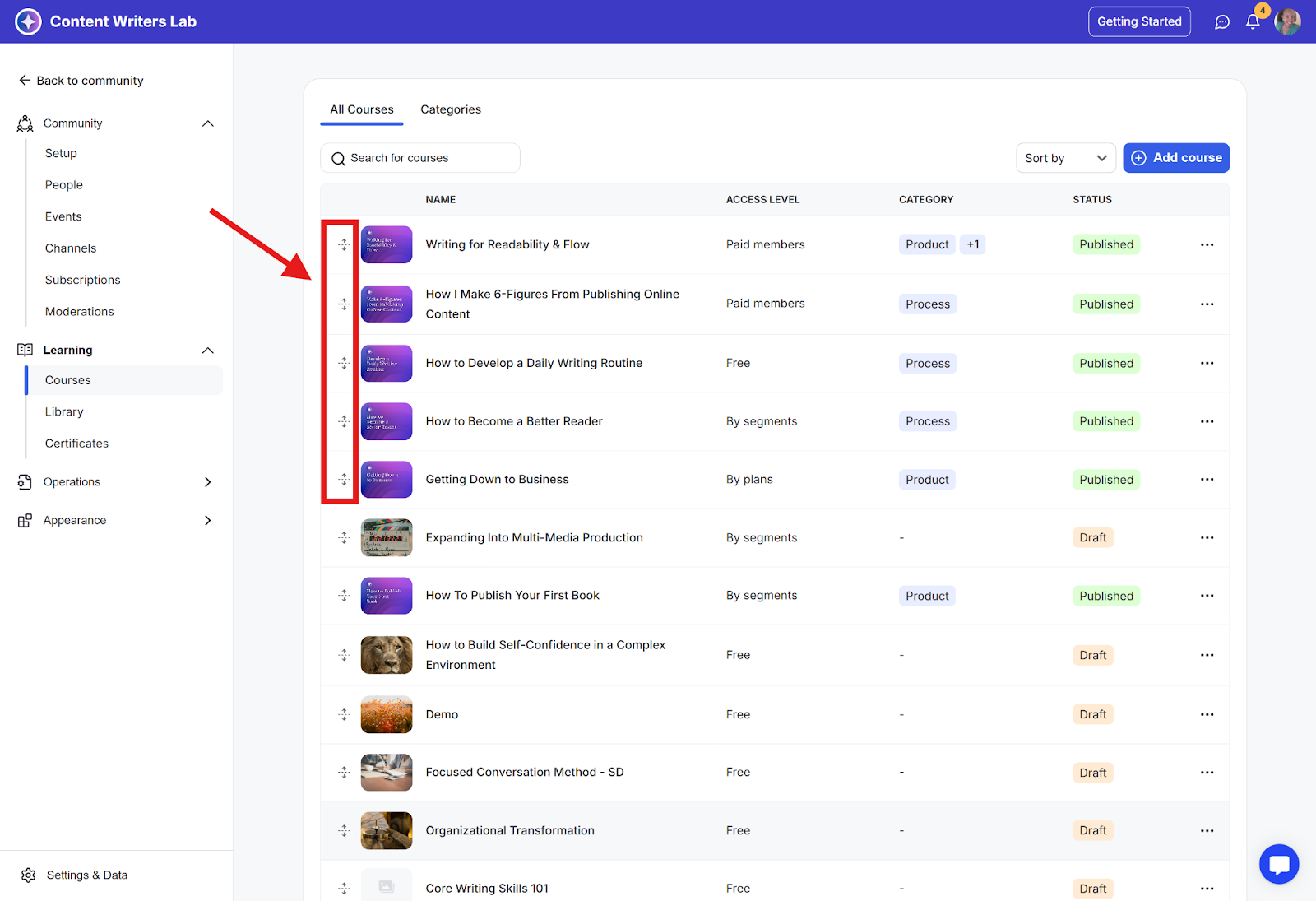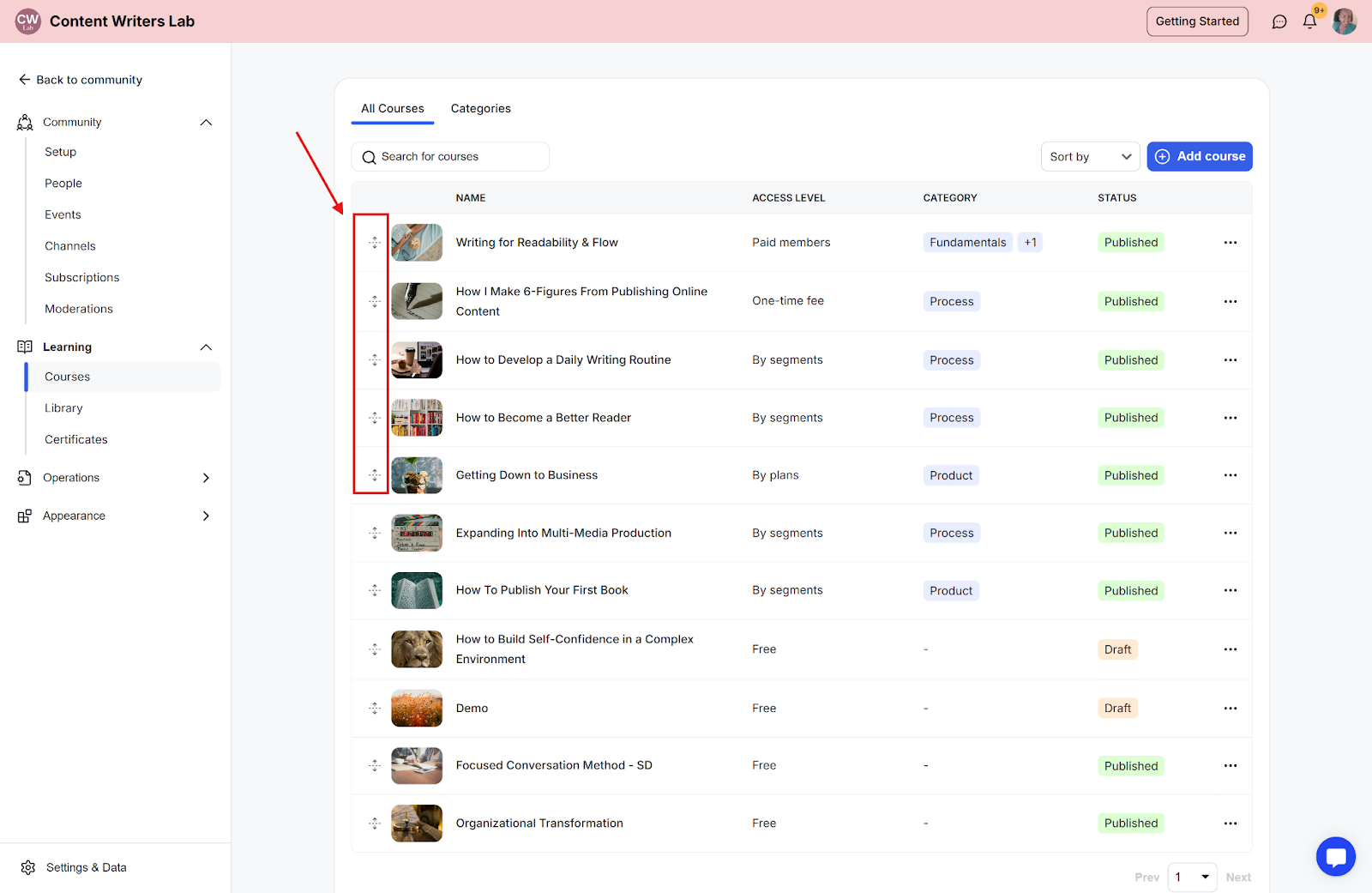 Step 1: Go to Courses/Library, and use these move icons to drag and re-arrange your courses/contents.