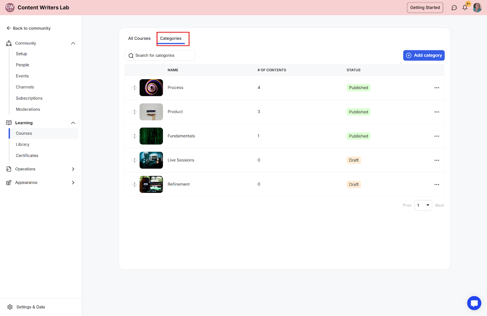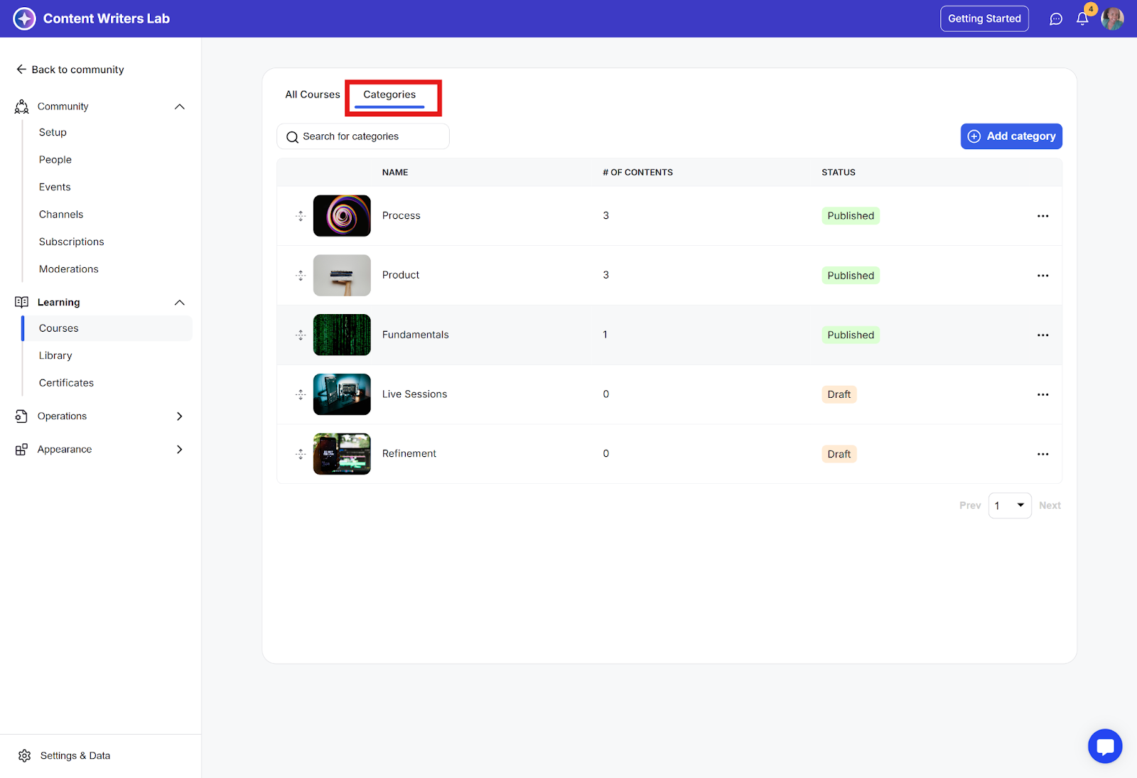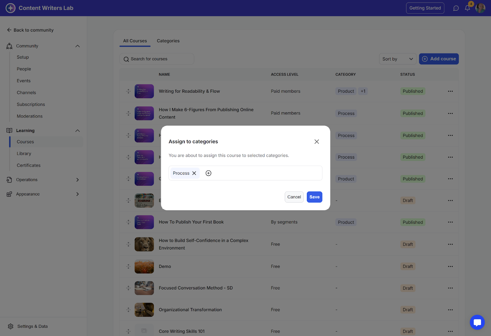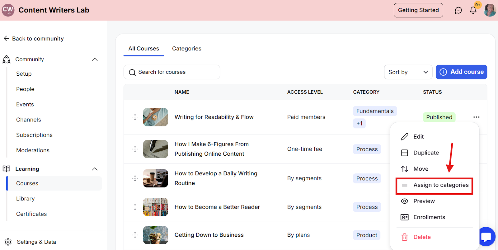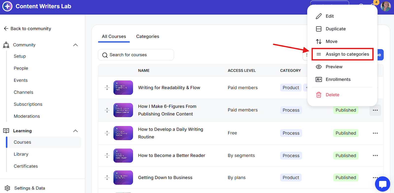 Step 1: Go to Courses/Library, click the 3-dot icon for the course/content, and select Assign to Categories.