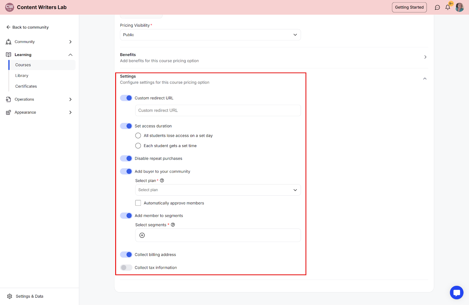 Each option can be turned on or off using its toggle, allowing you to control access and post-purchase behavior.
