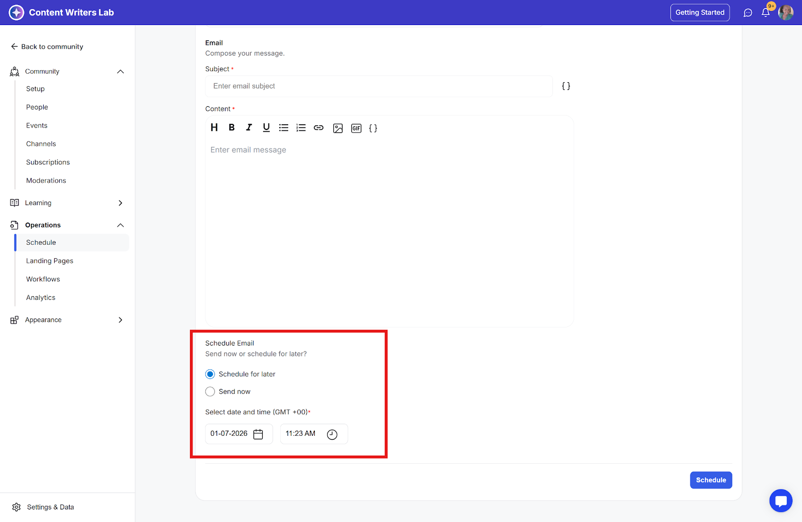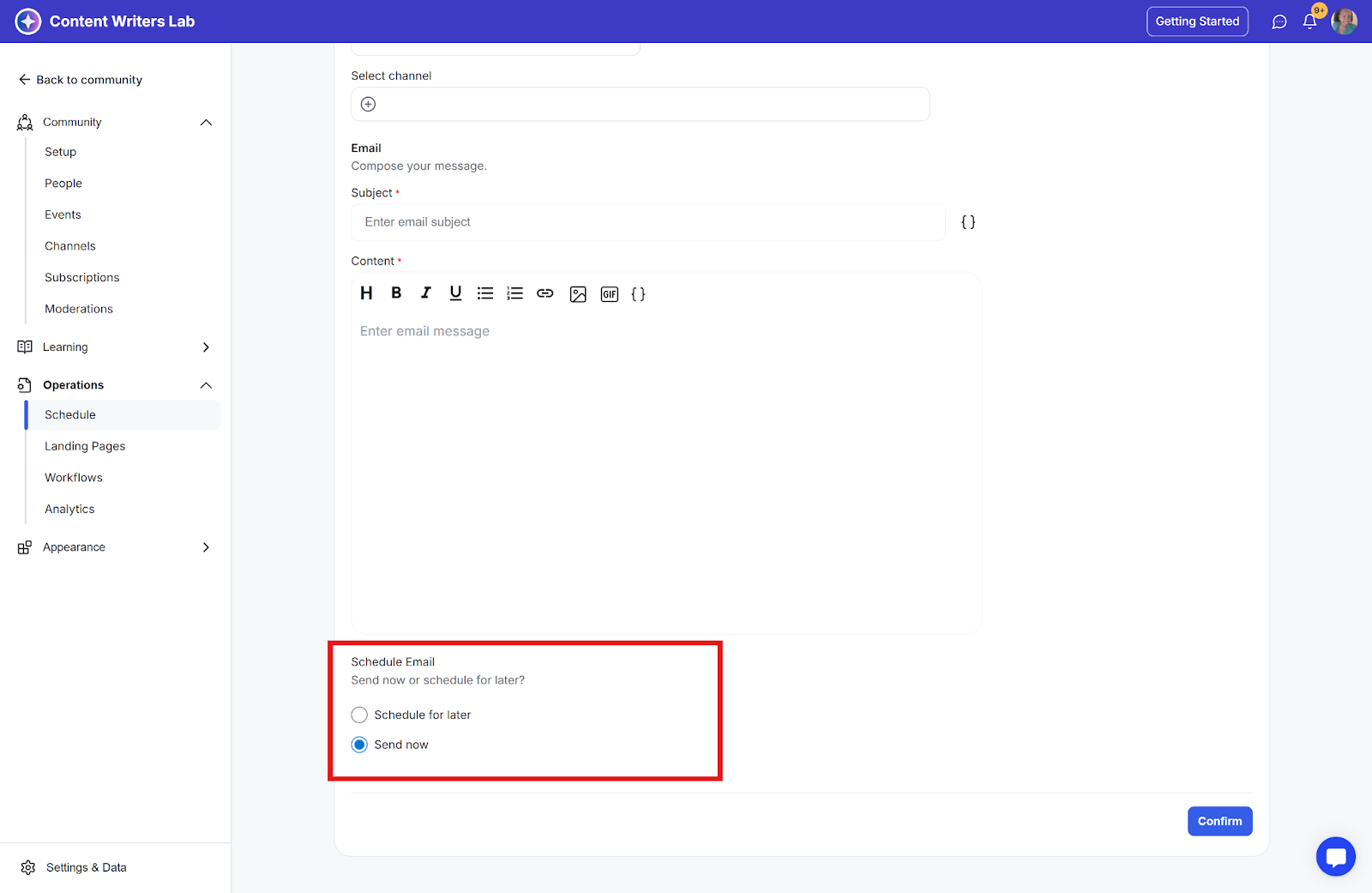 Schedule for later: The Email/Post will be sent to the audience on the selected date and time.