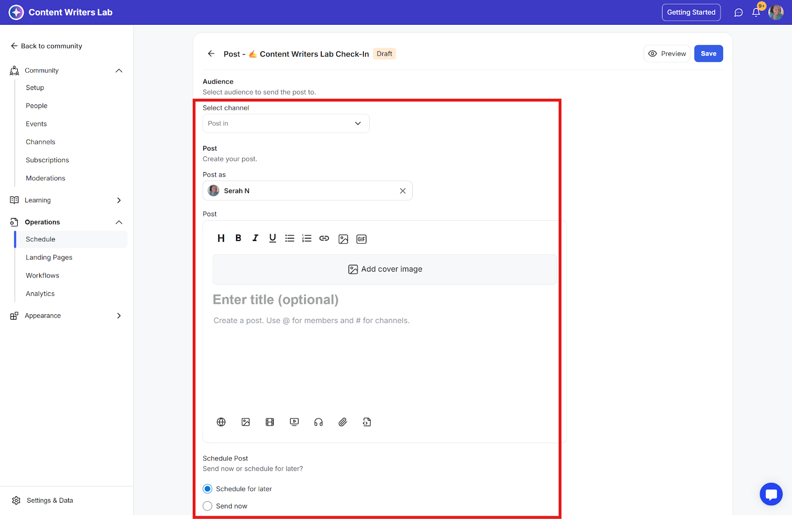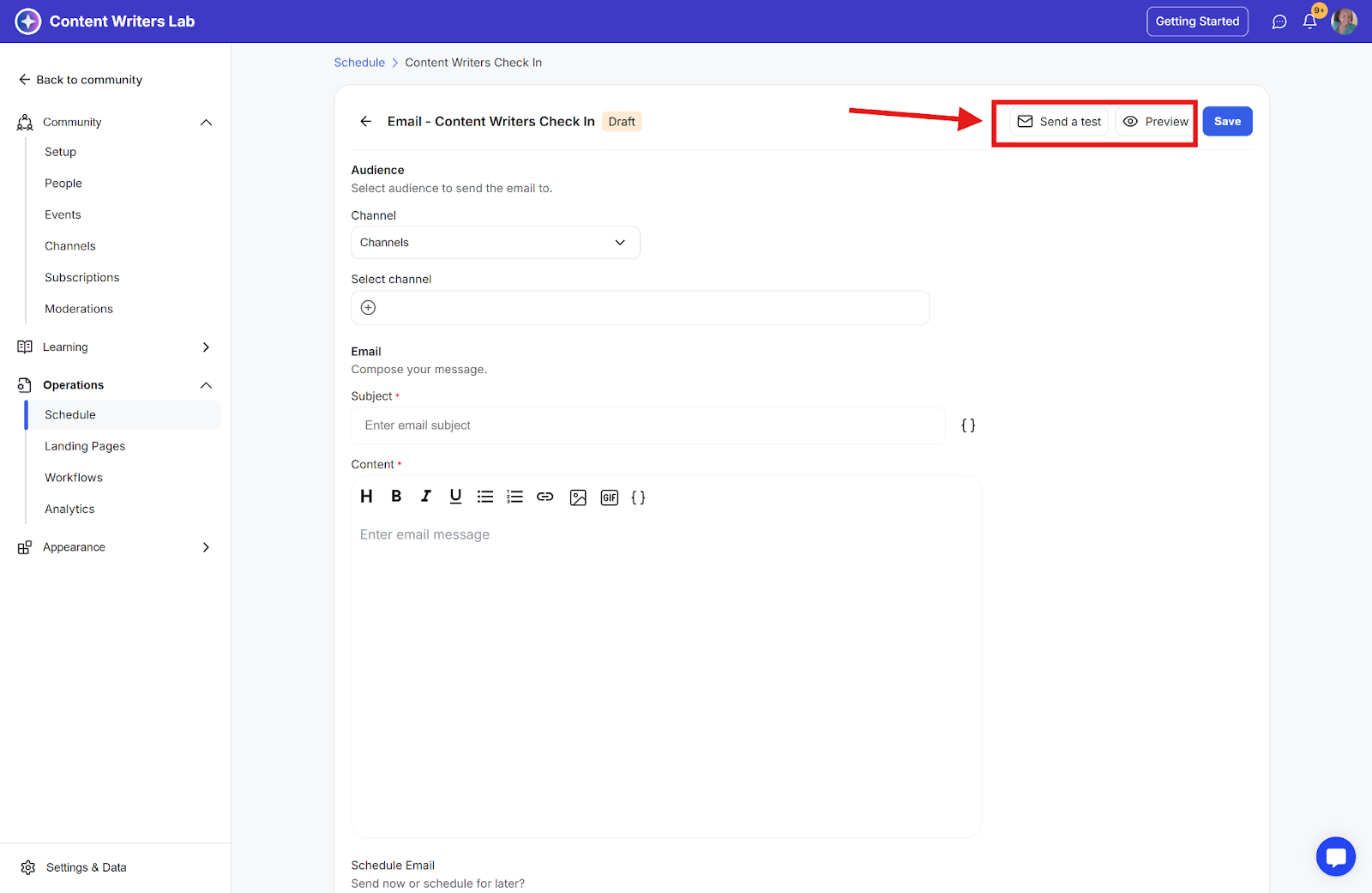 Step 6: For posts, you can preview the content before publishing. For emails, you can preview the message and send yourself a test email.