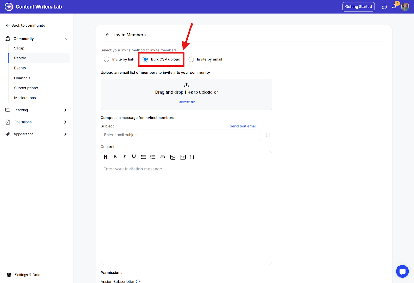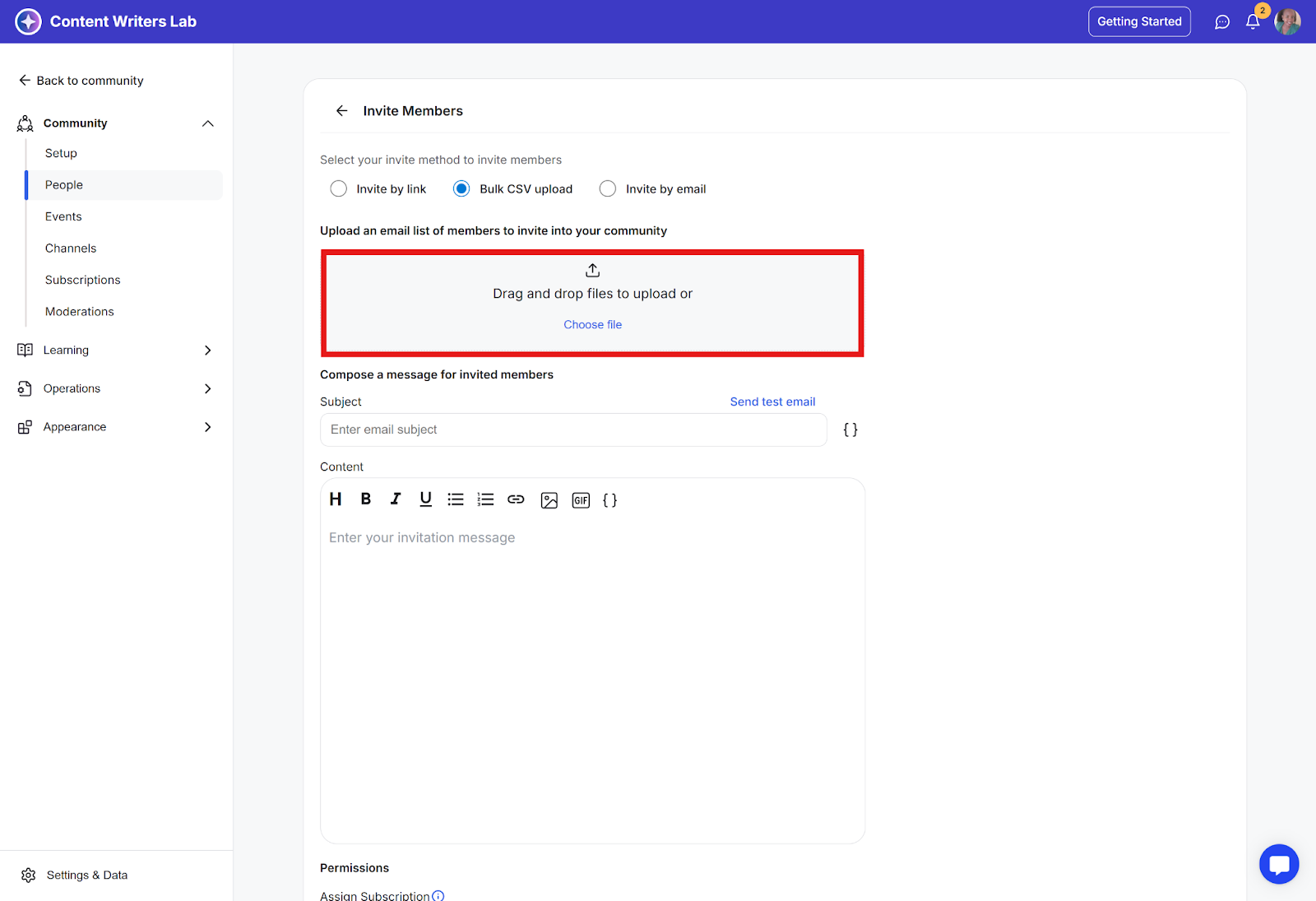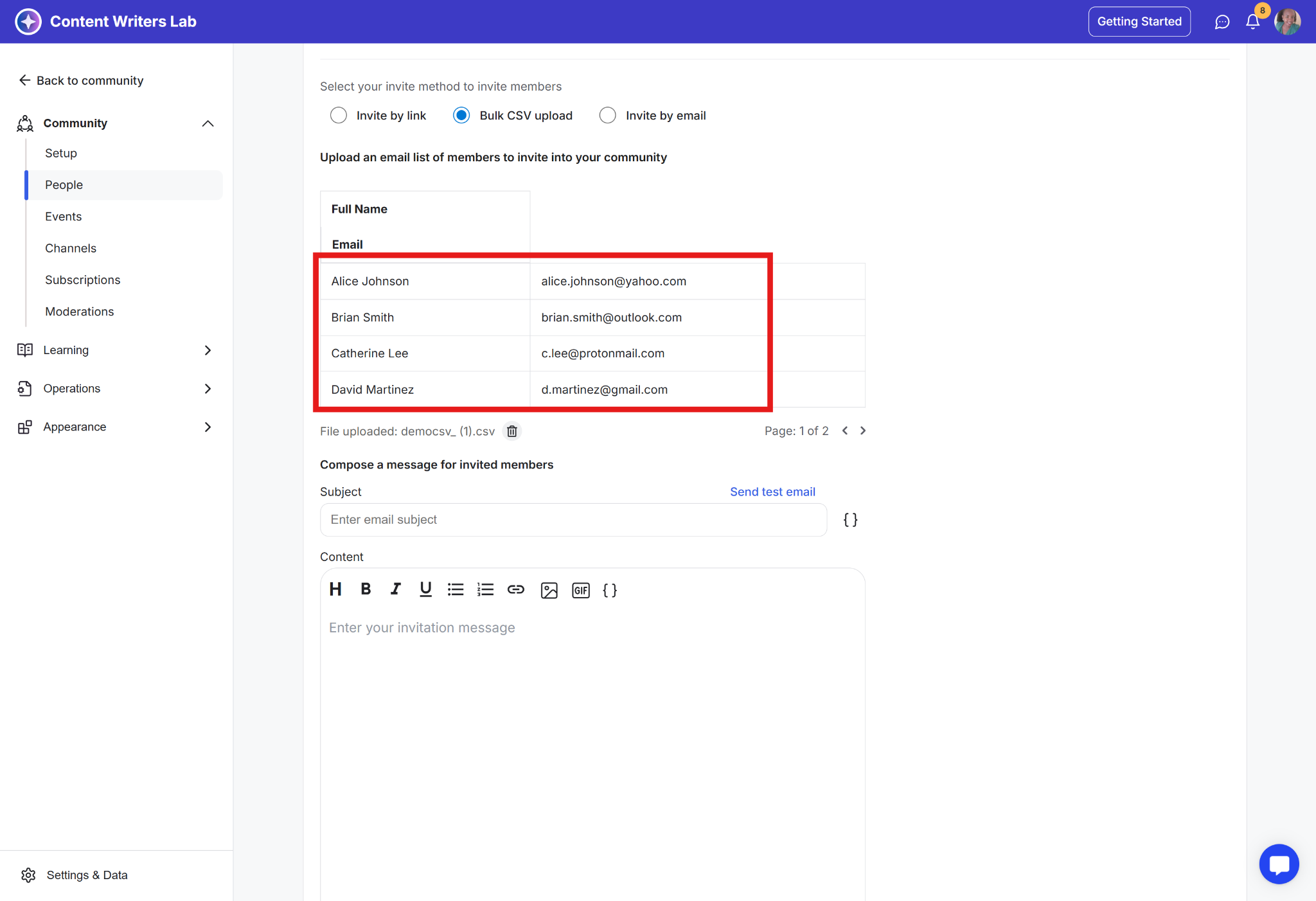 Use Bulk CSV invites to invite multiple contacts to your community at once. This feature should only be used to invite contacts who have already agreed to receive an invitation.