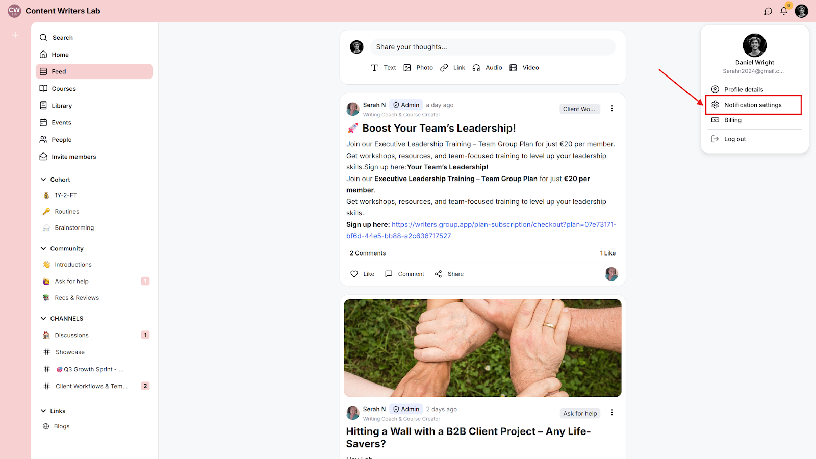 Step 1: As a community member, click on your Profile Image in the top-right-hand corner and select Notification Settings.