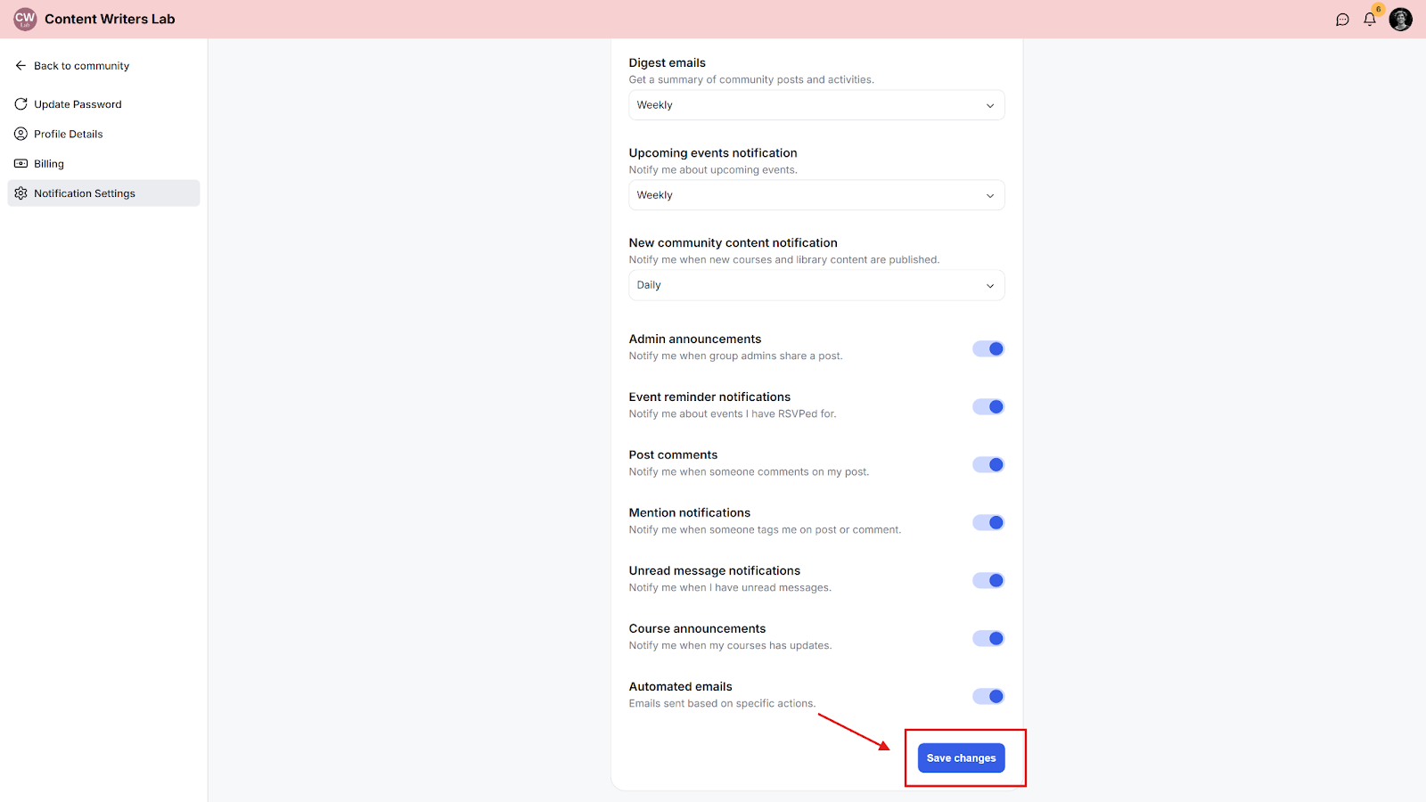 Step 2: Select the option of the corresponding community email notifications you want to receive under the Profile Notifications section.