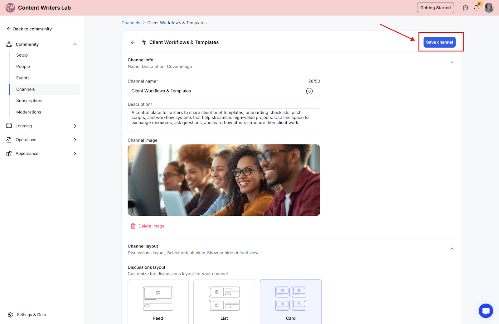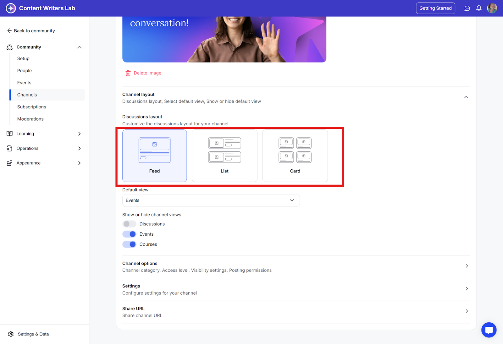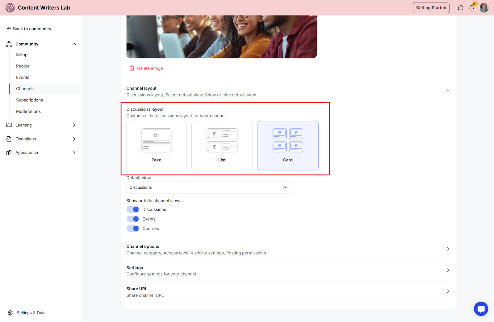 Step 5: Click Channel Layout to open the Discussions Layout section. You will see the three layout options: Feed, List, and Card. Click the layout you want to use. The selected layout will turn blue to show it’s active.