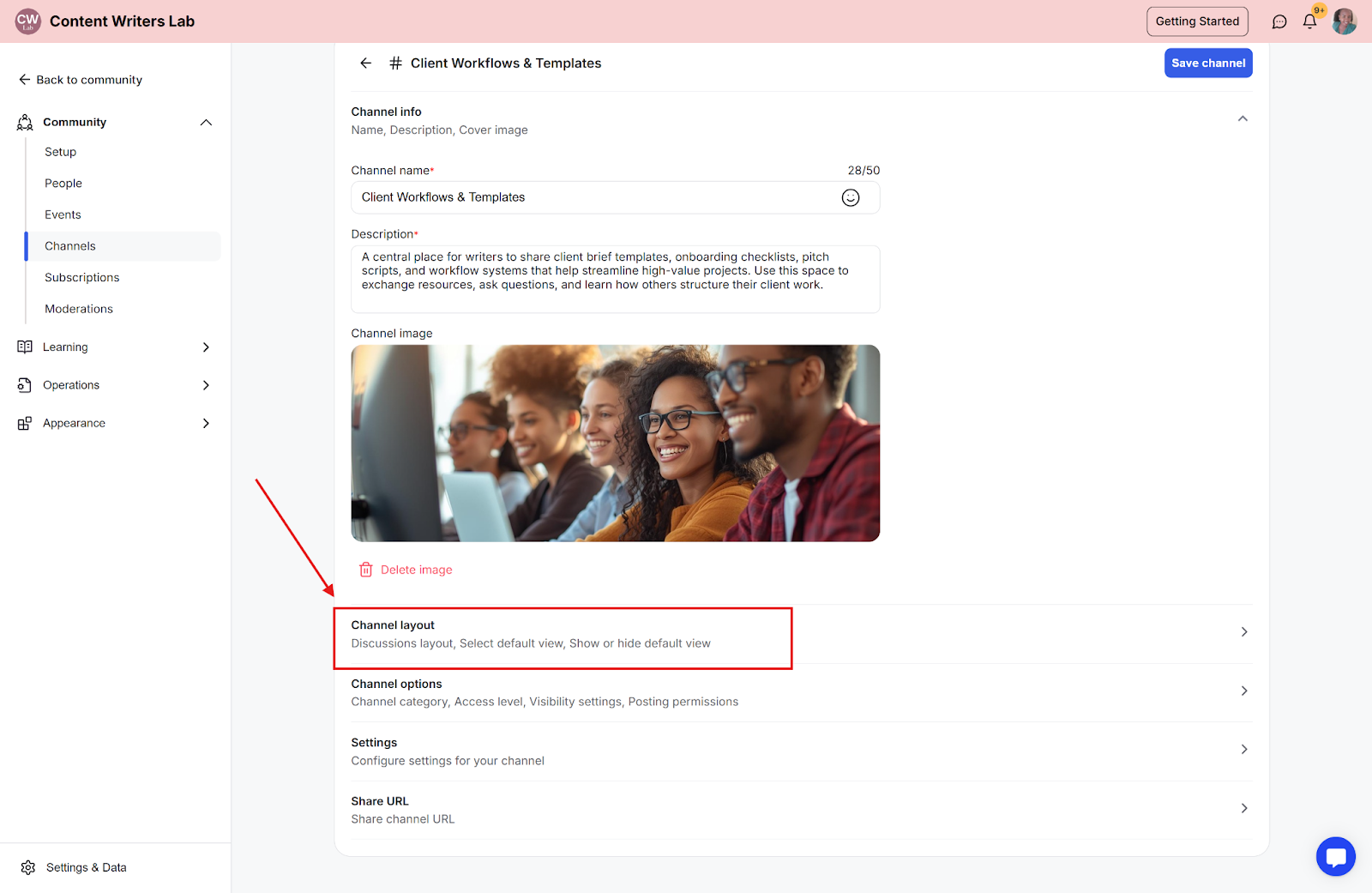 Channel layout options let you choose how posts, updates, and content appear in a channel.