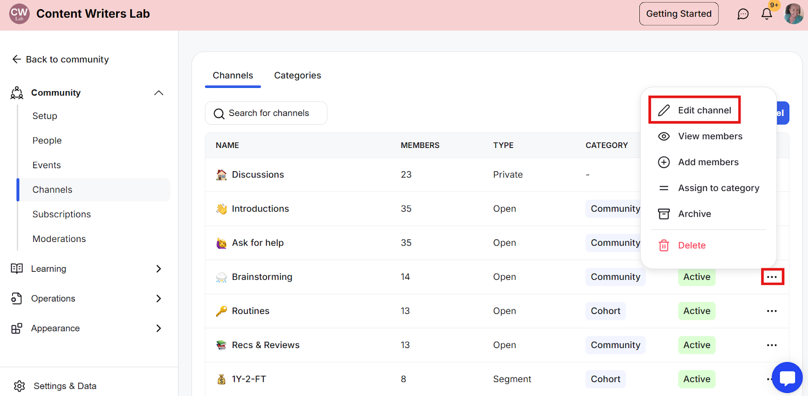 Step 3: Find the channel you want to change, click the three-dot menu on the right side of the channel name, then select Edit Channel.