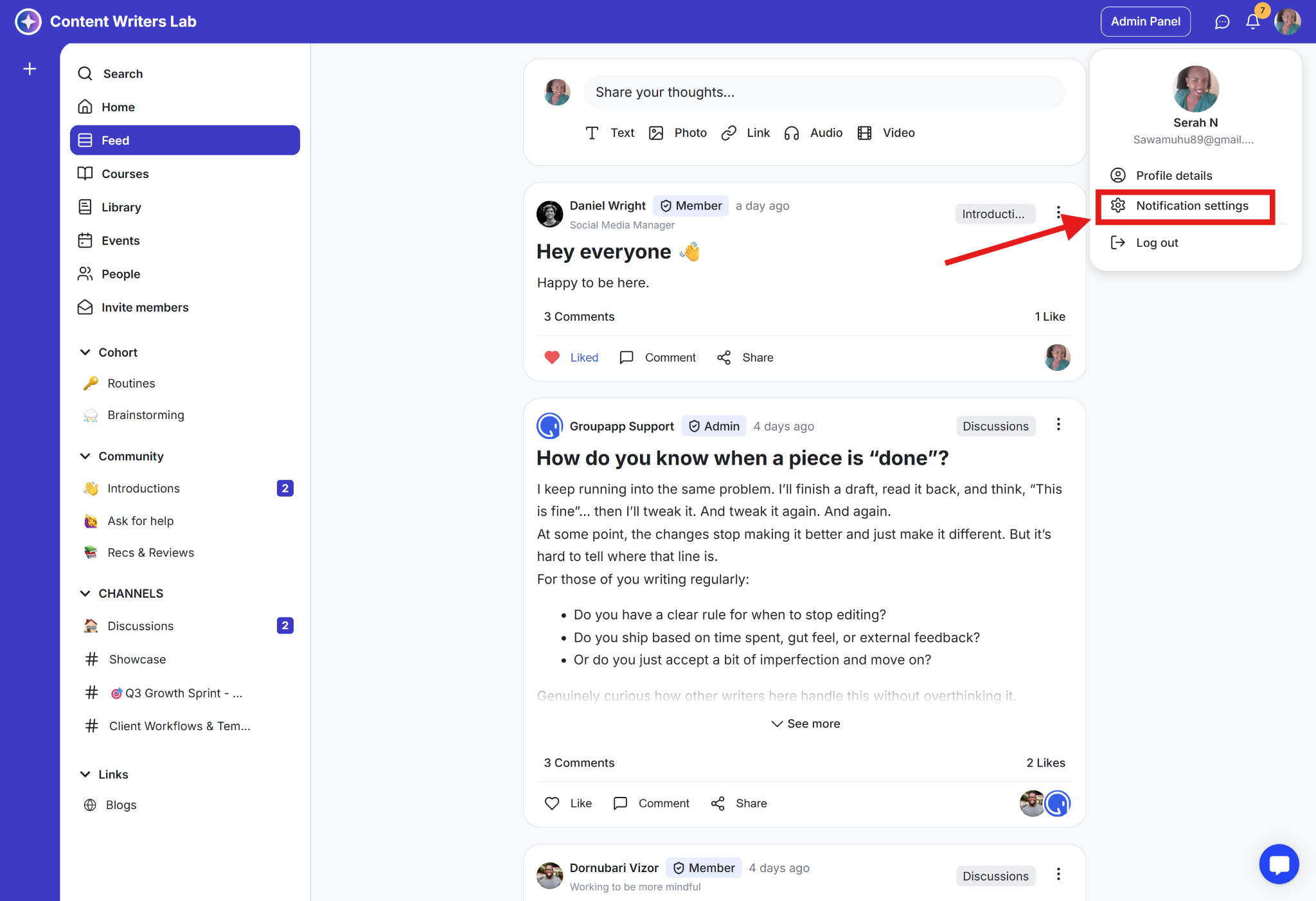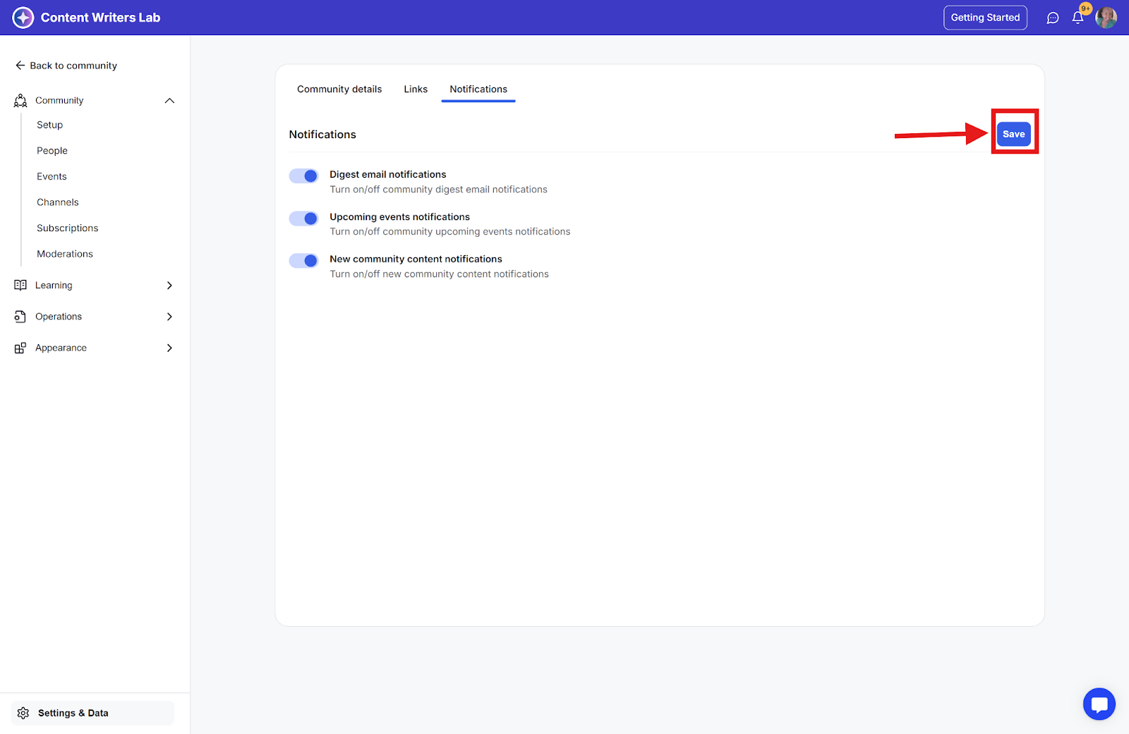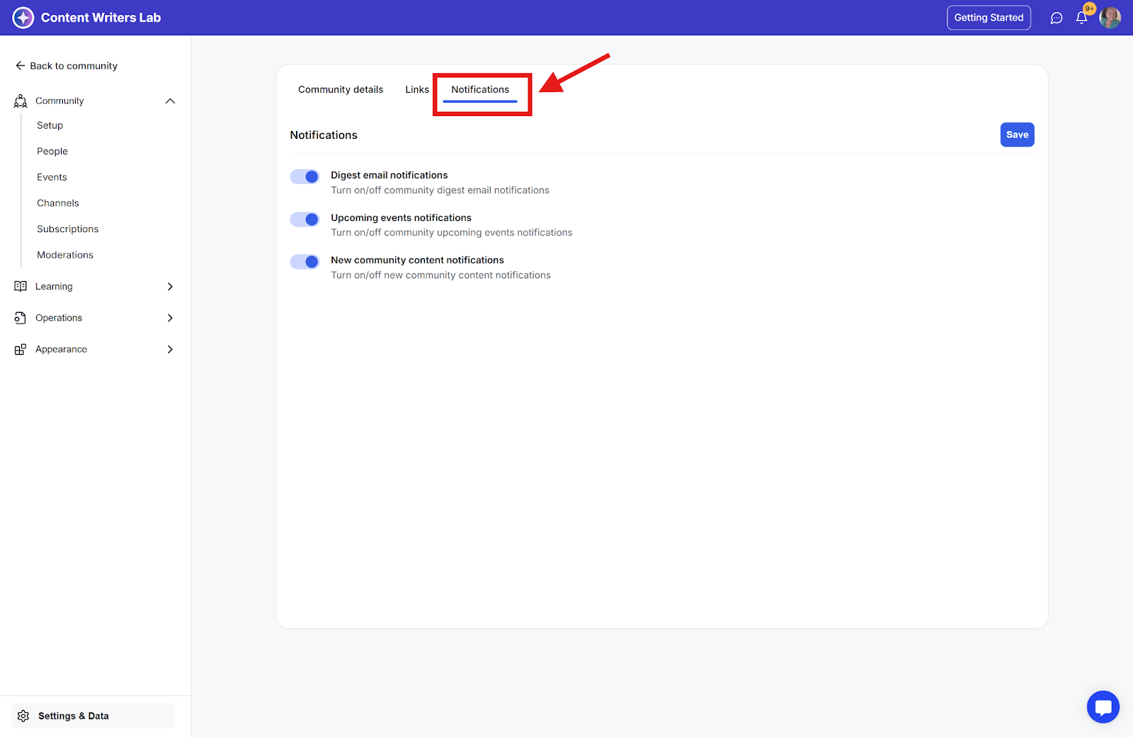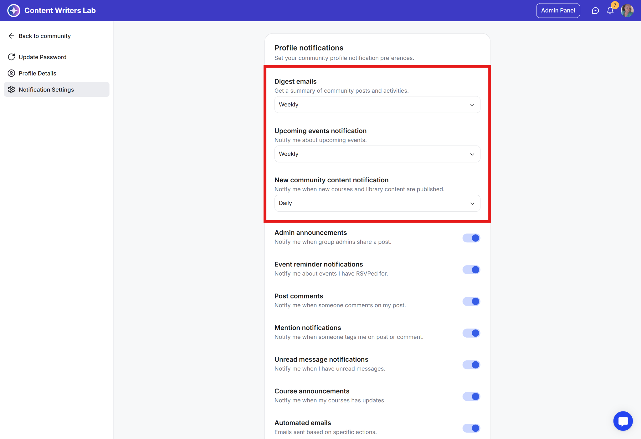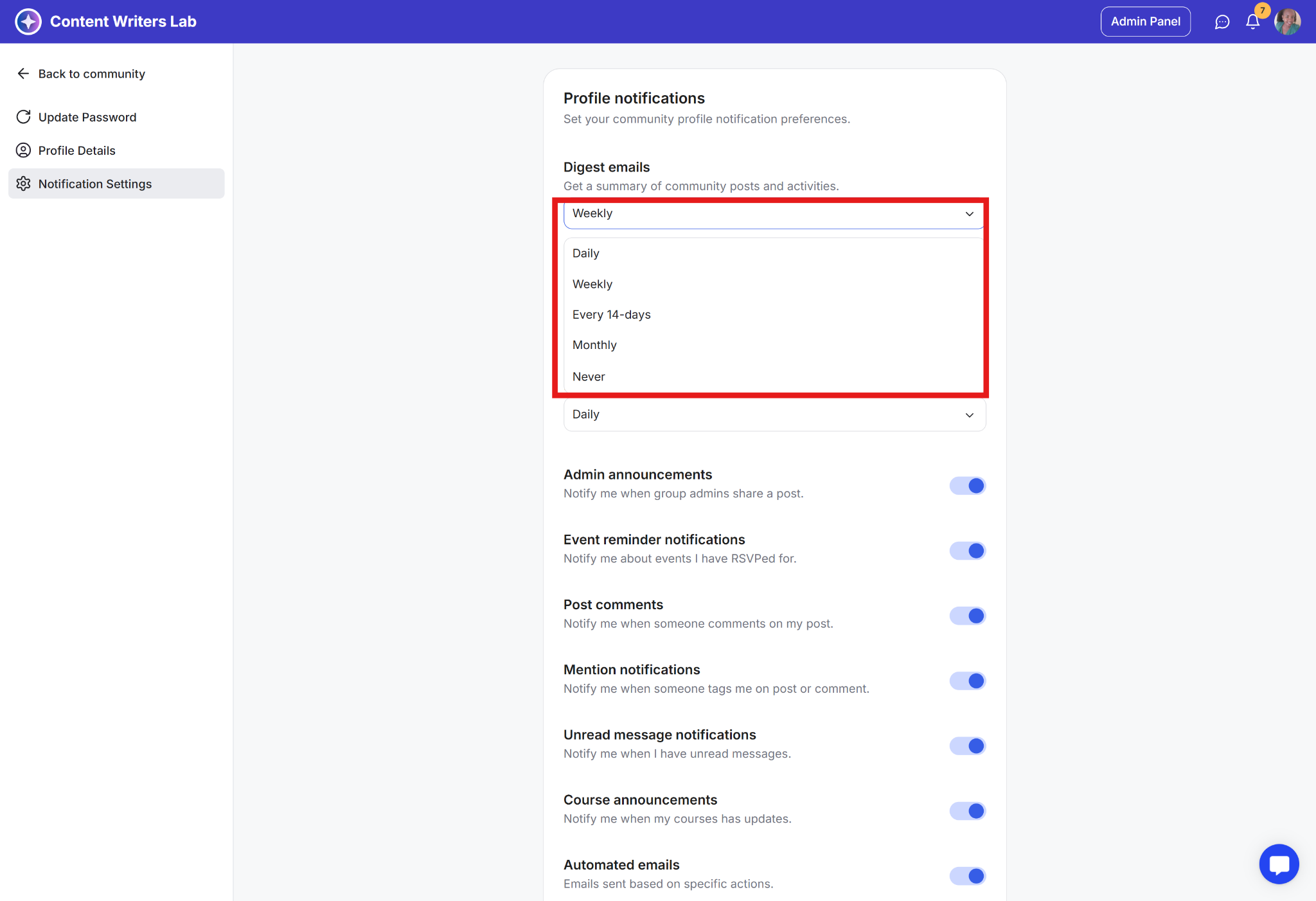 Admins can also manage digest notifications that apply to the entire community.