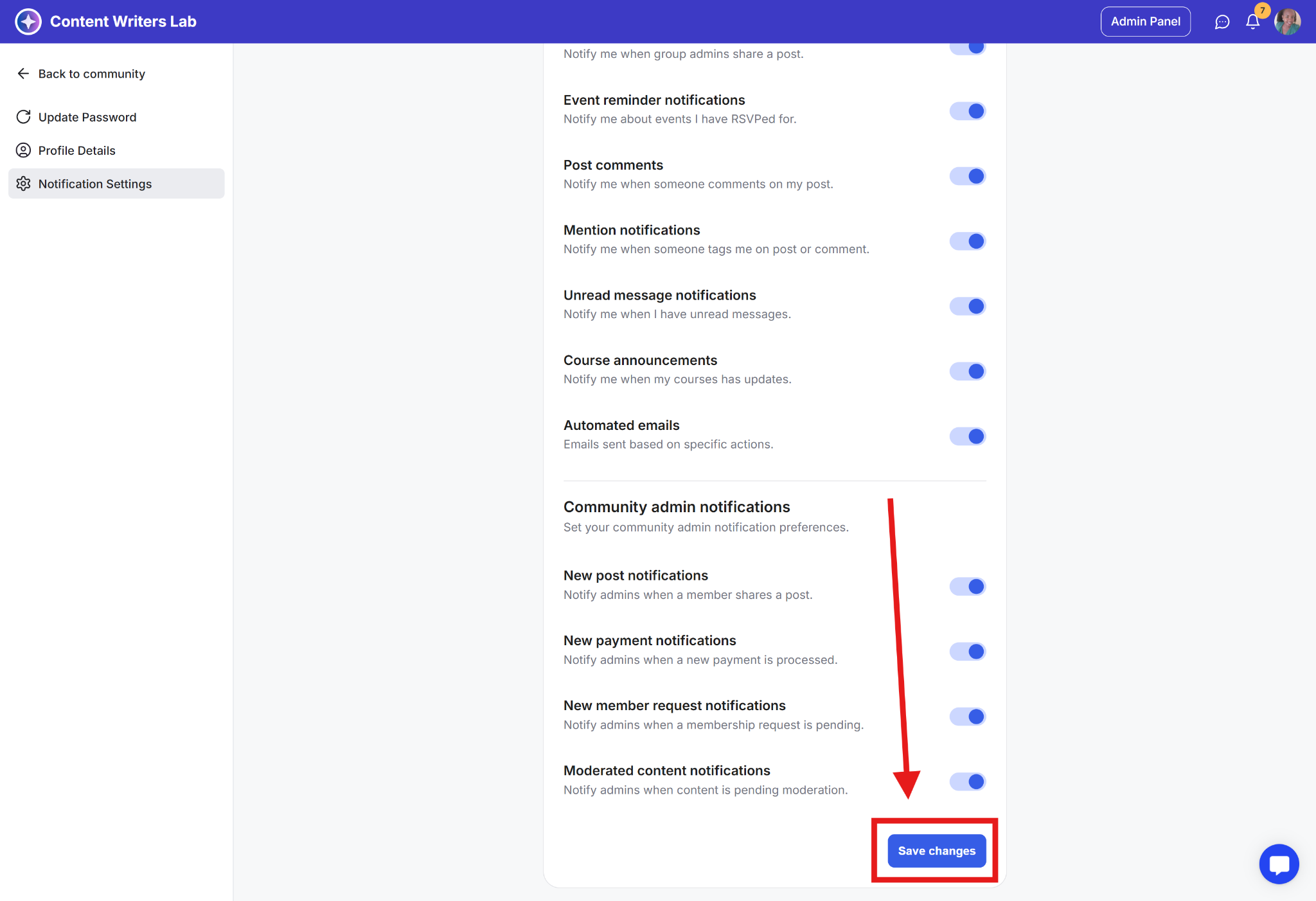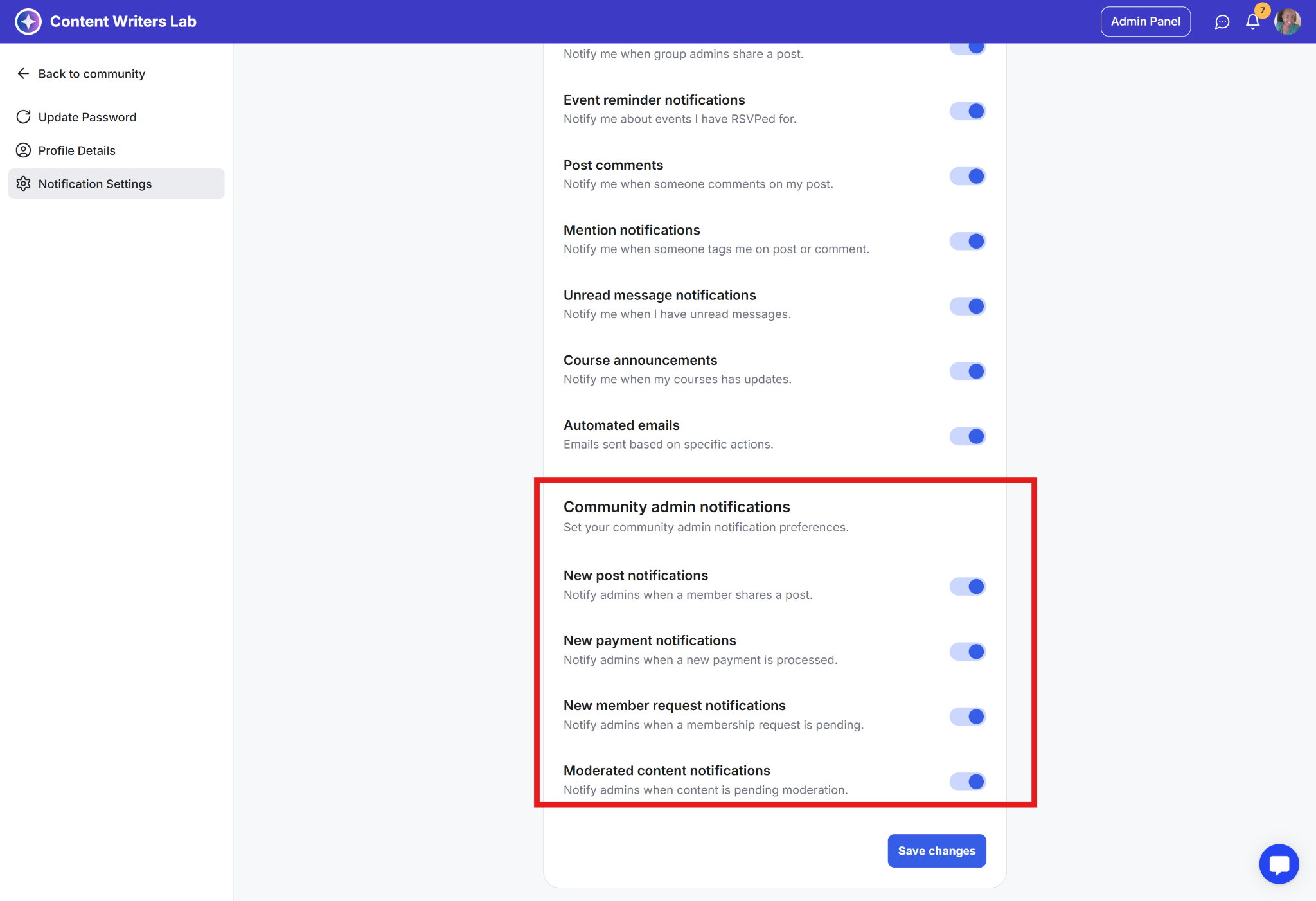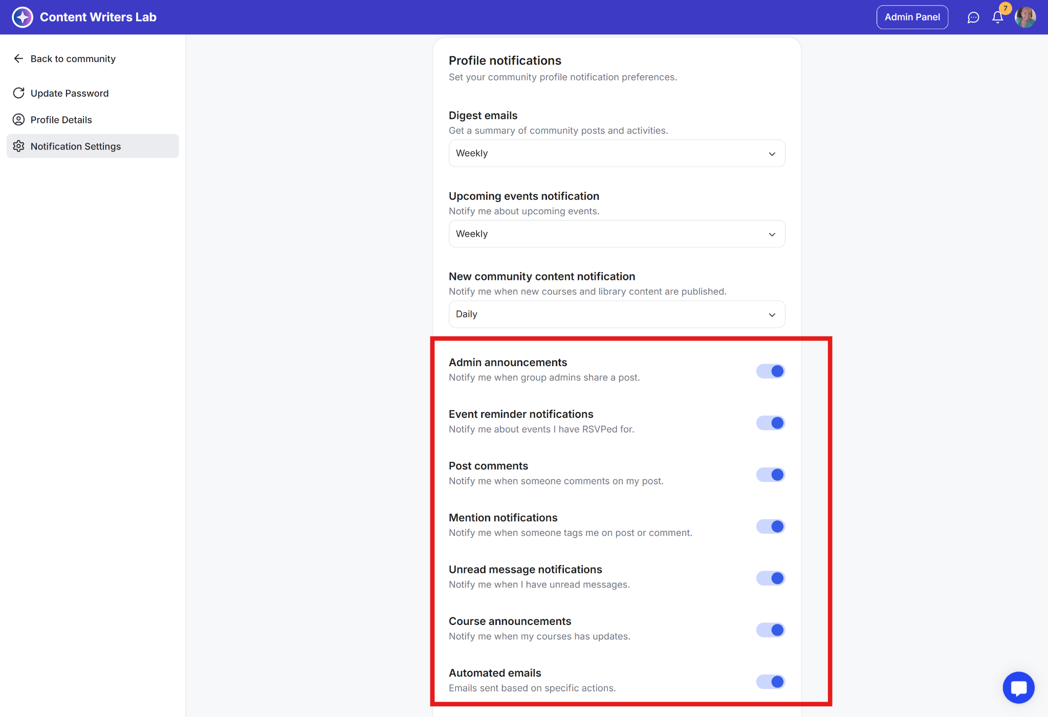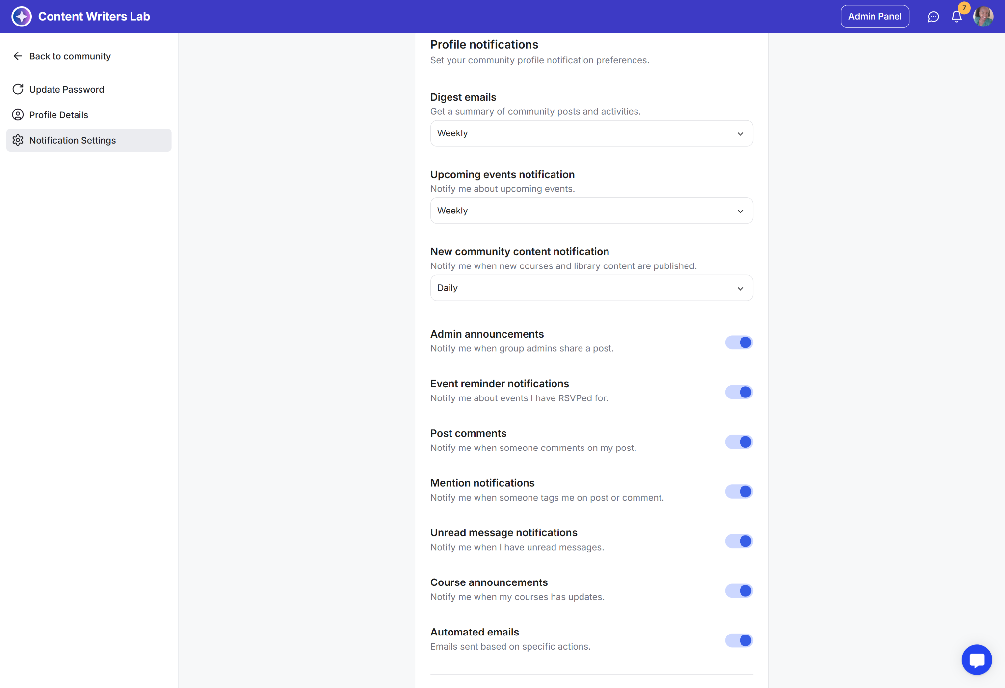 Community admin notifications: Manage admin-related notification preferences.